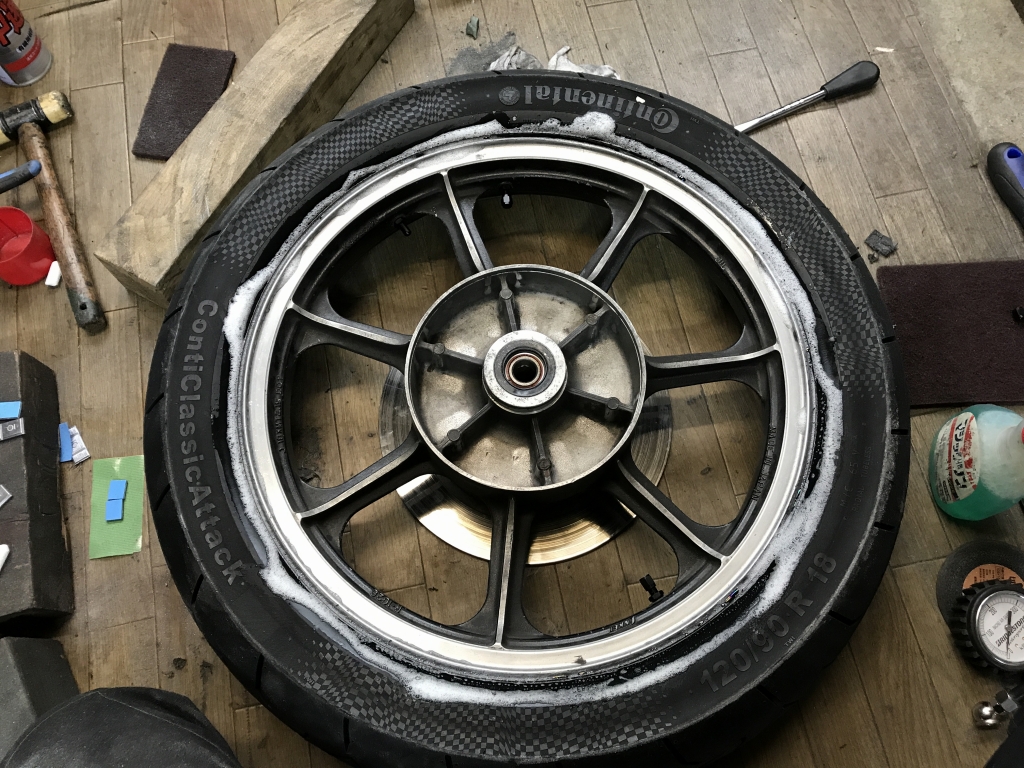 タイヤを組んだら念のためエア漏れが無いかチェックします。