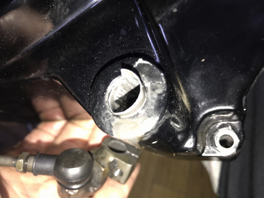よくみると、スプロケットカバーにある軸受穴がかなり摩耗して前後方向に長穴になっているようで、シフトペダルの動きに大きなガタが発生しています。シャフトが傾くせいで動きが渋くなっているもよう。