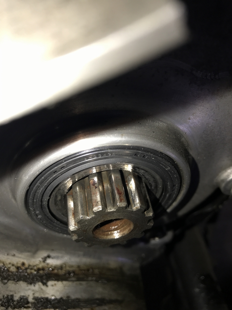 フロントスプロケを外します。アウトプットシャフトのオイルシールの打ち込みが浅く、面一になっており、最外のリップがシャフトからはみ出しています。