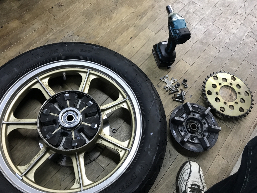 リヤスプロケを交換するのでリヤホイールを外します。