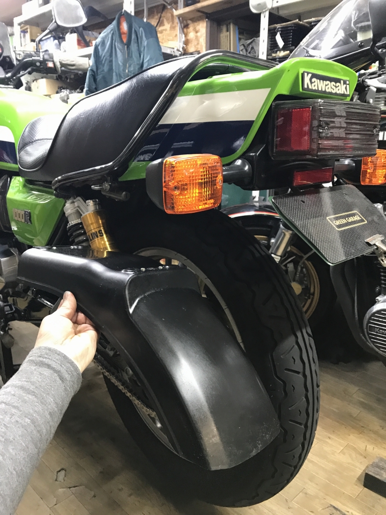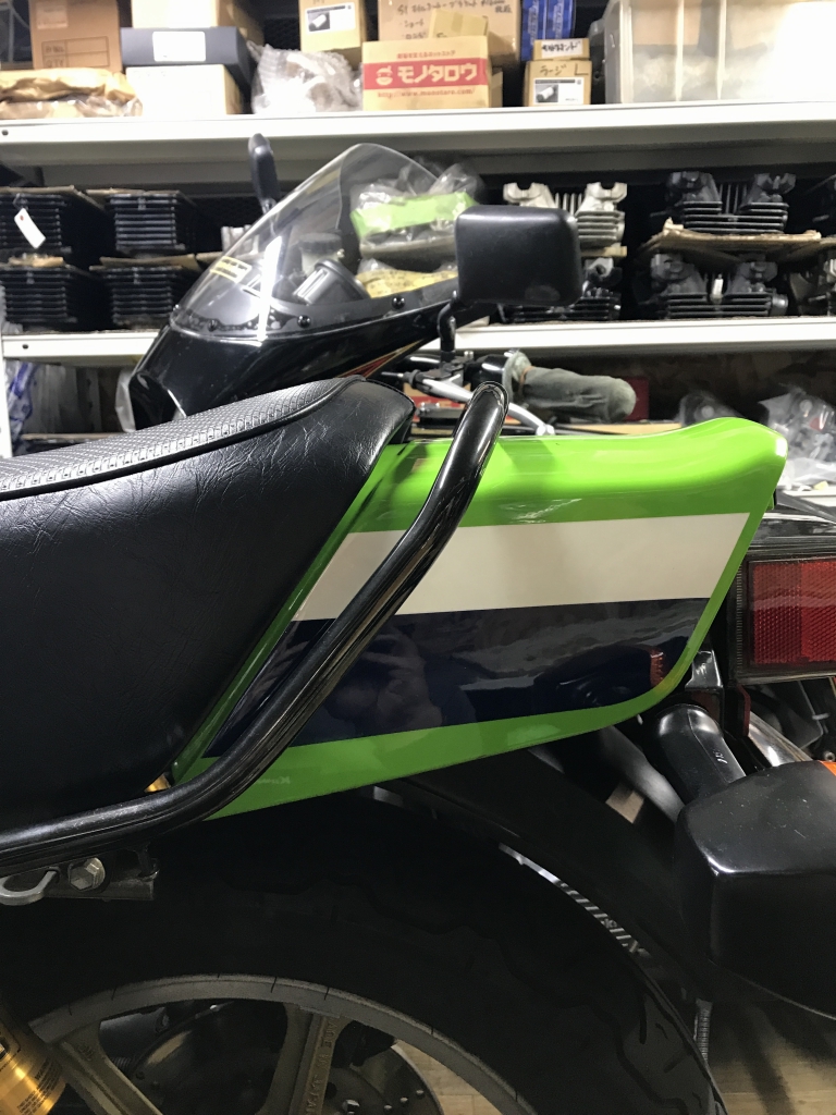 純正リヤフェンダーも付き、まとまった雰囲気になりました。ナンバーの角度も寝すぎなので、純正の角度にしたいですね。