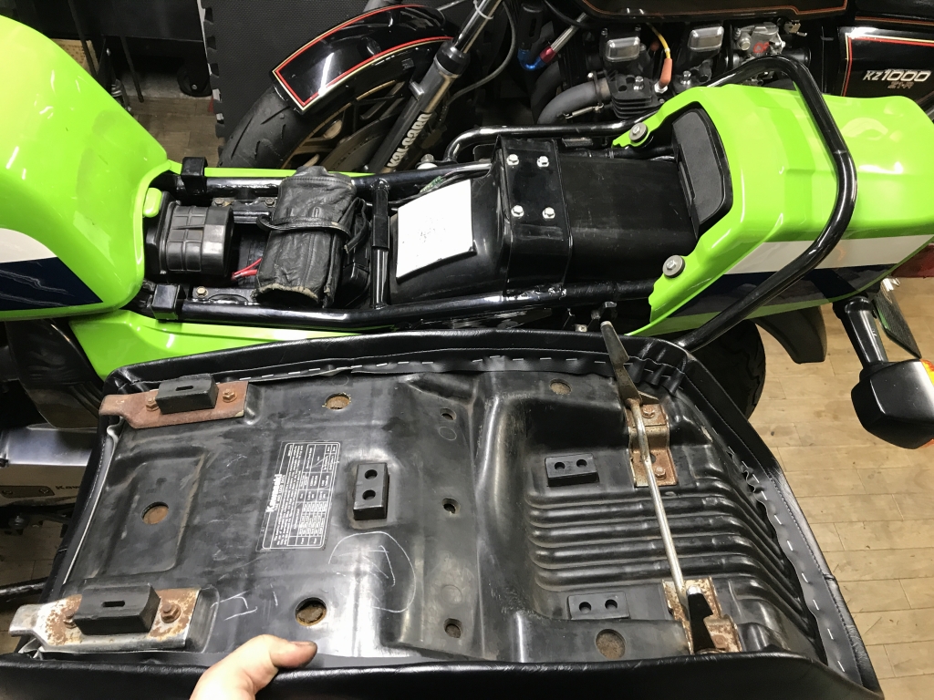 シートを外してリヤフェンダーを取り付けます。シートのダンパーは中央のものを高くすると、シートが若干逆ぞりしてテールカウルとの隙間が少し小さくなります。