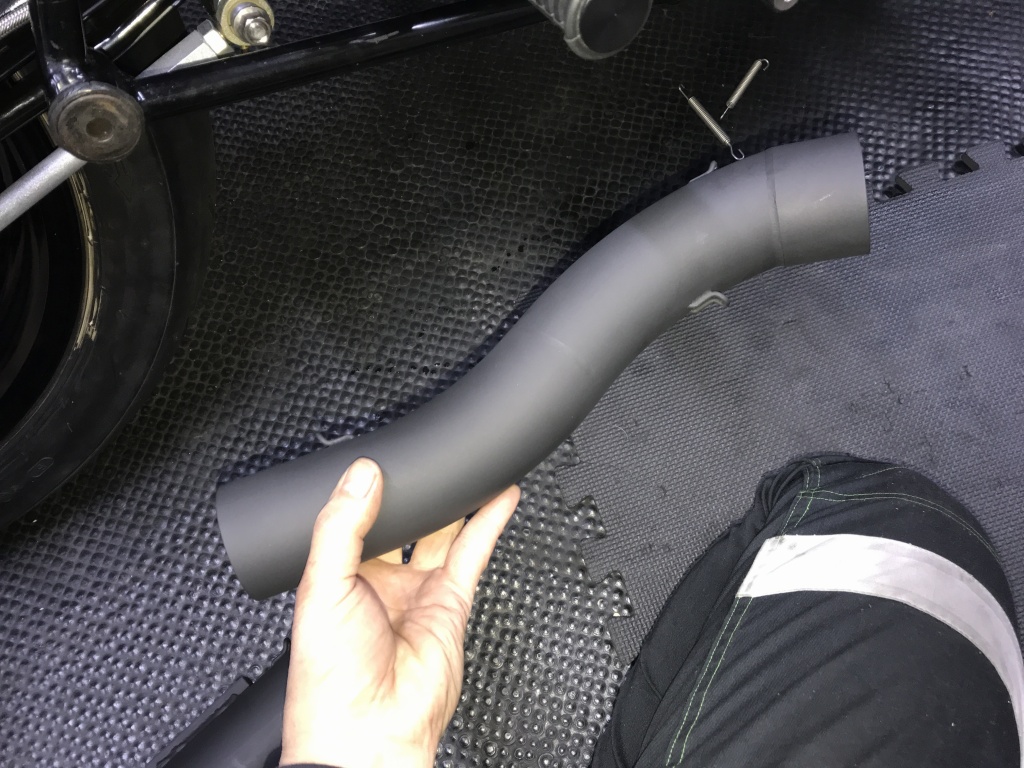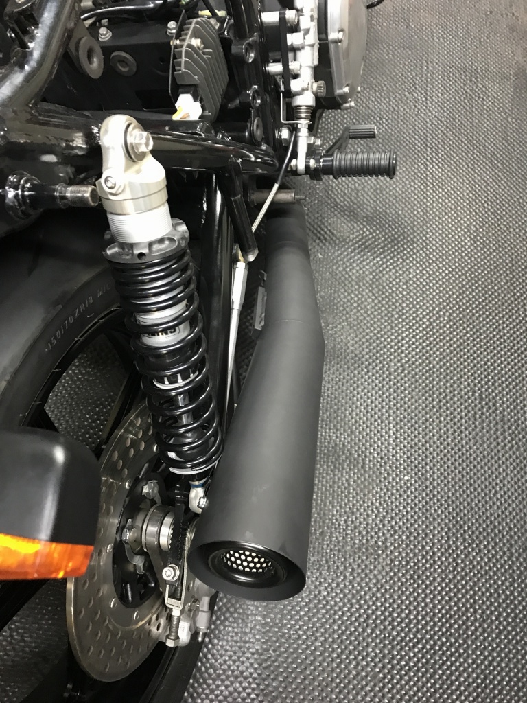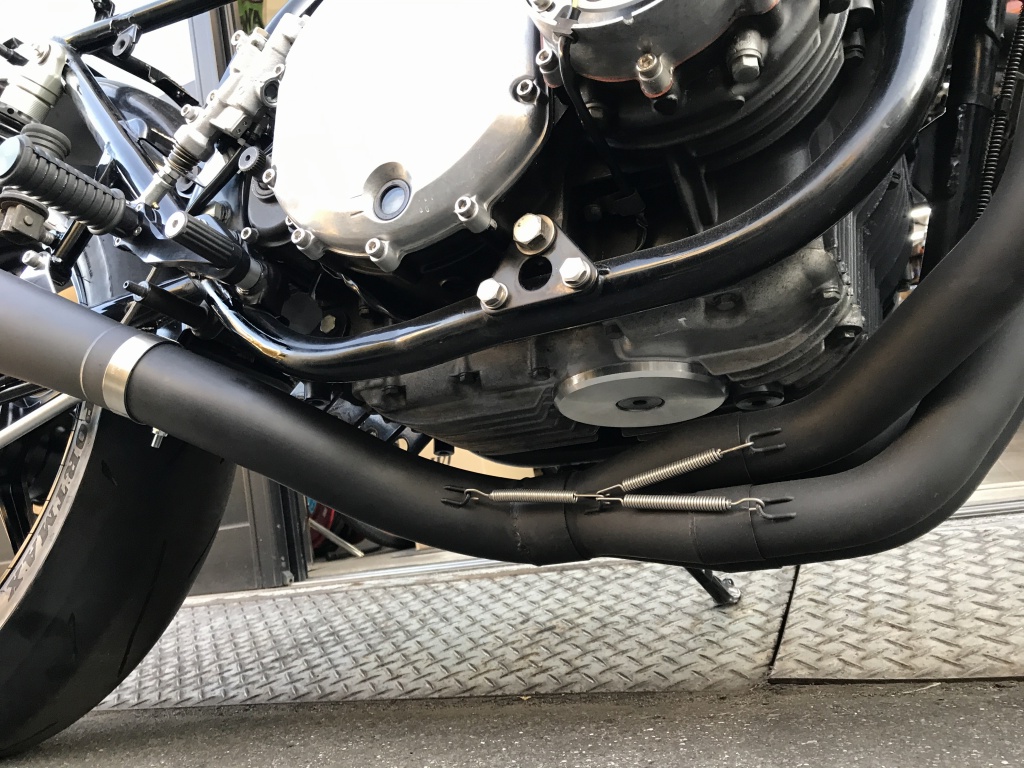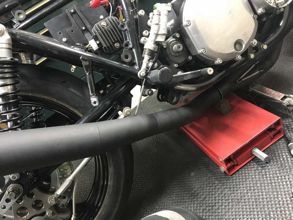 ワークスタイプの特徴的な中間パイプです。ロングタイプはこの部分が長くなっています。アップ形状もこのパイプの曲がり具合で変化させています。