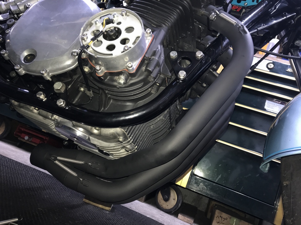 オイル交換する際はエキパイを左右に振り分けこの状態でフィルター交換まで可能です。
