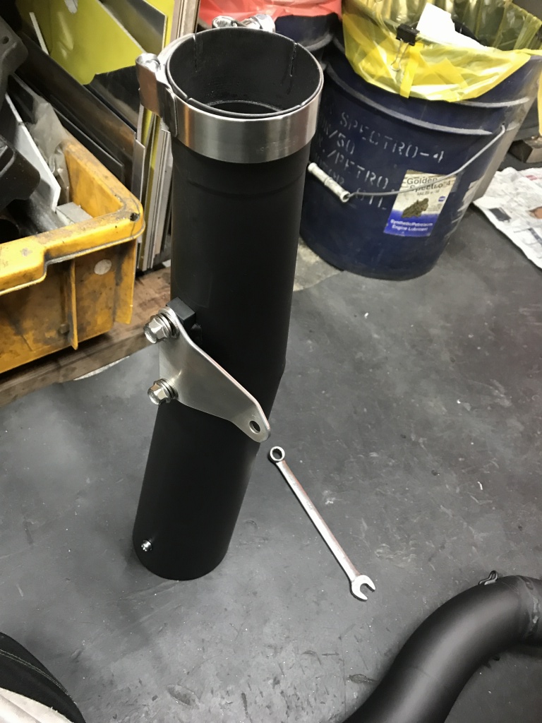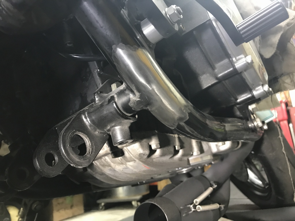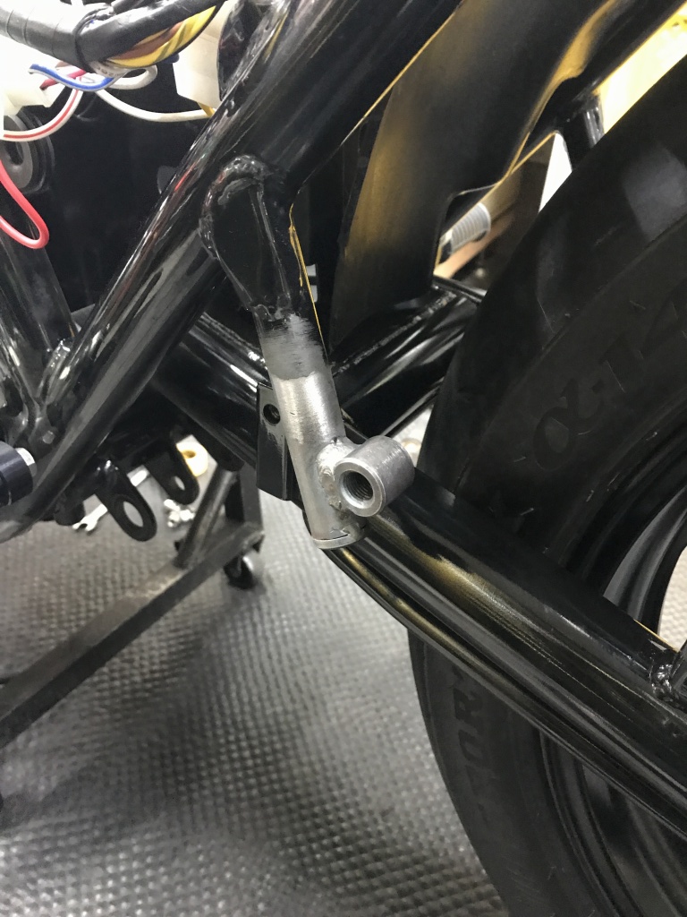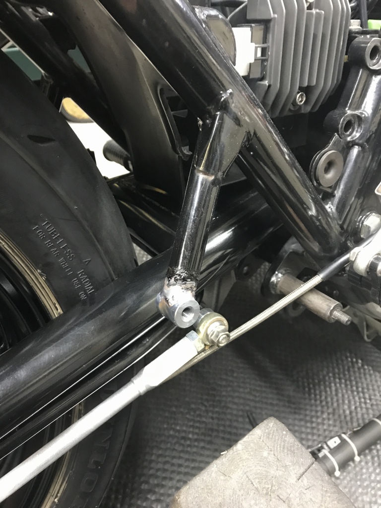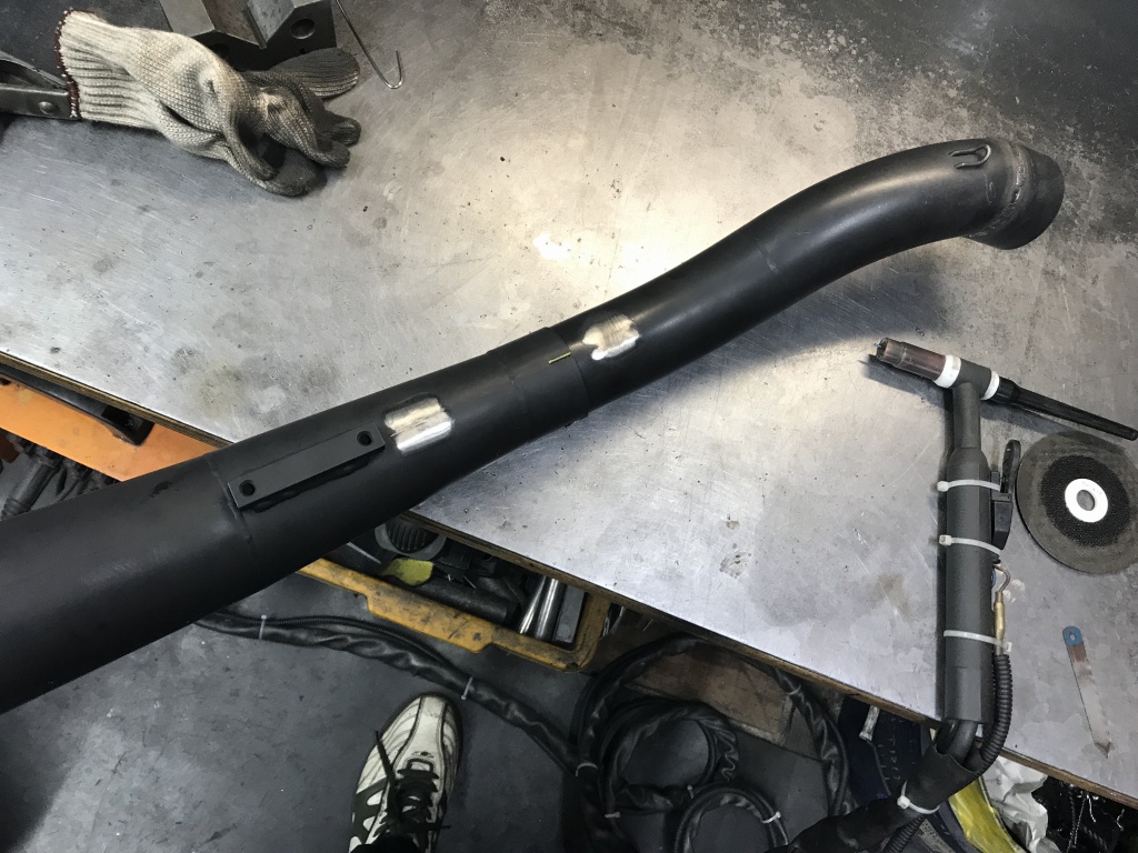 一旦取外し、全周溶接します。サイレンサーの差し込みはスプリング止めからバンド止めに変更するのでフックを削除します。