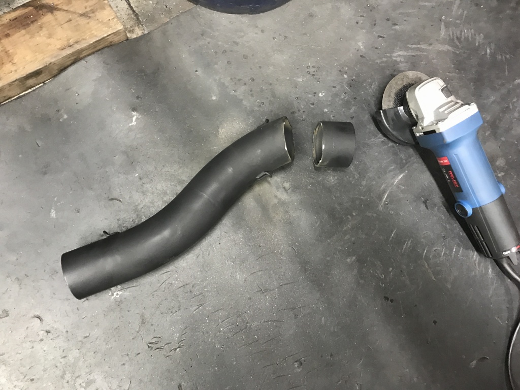 角度を振って少し外側に出したいので、中間パイプをカットして合わせ面を加工します。