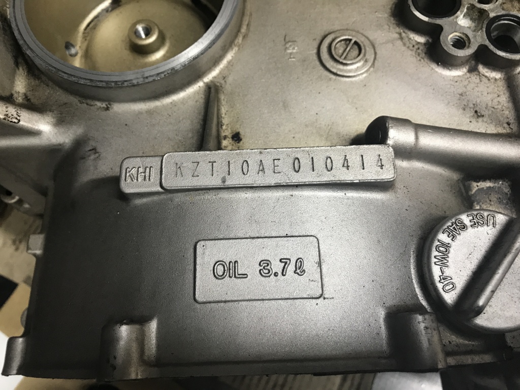 ゴールドに塗られたこのクランクケースは1100スペクターの物です。「KZT10AE」の刻印がそれを表します。「10」は排気量1100ccを「AE」でゴールドはスペクターとなります。構造変更すればJ系のどの車両にも公認で使用可能です。