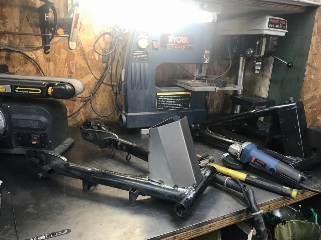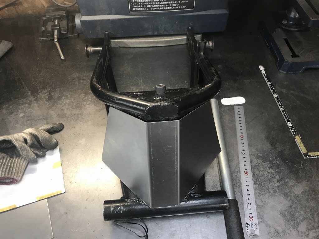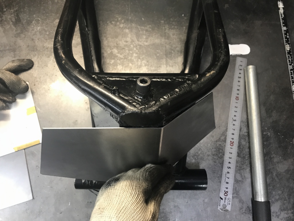 裏側の板も取り付け、スイングアームに溶接で仮付けします。