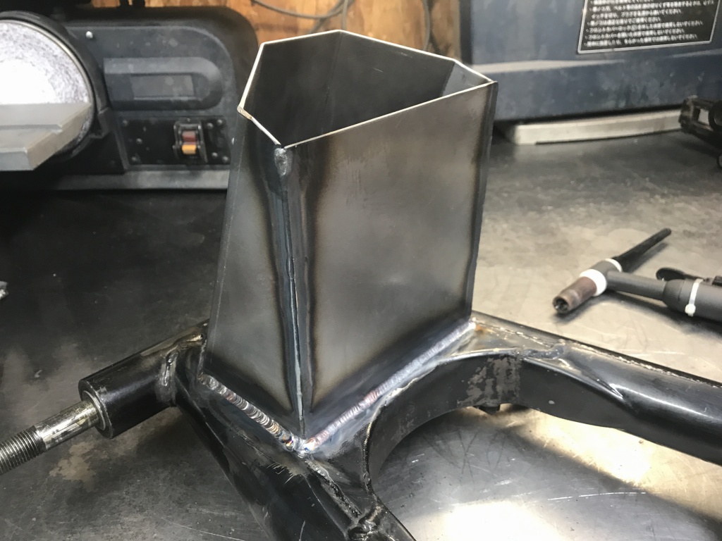 両サイドから左右均等に溶接していきます。ピボット部分の溶接は一気にやるとひずみやすいので、そこは少しずつ。