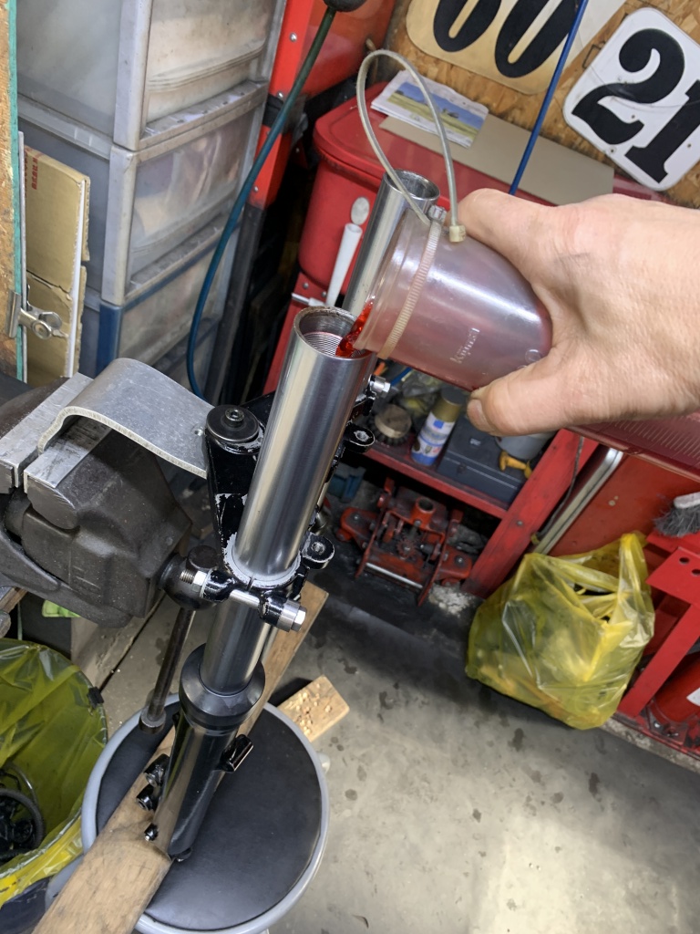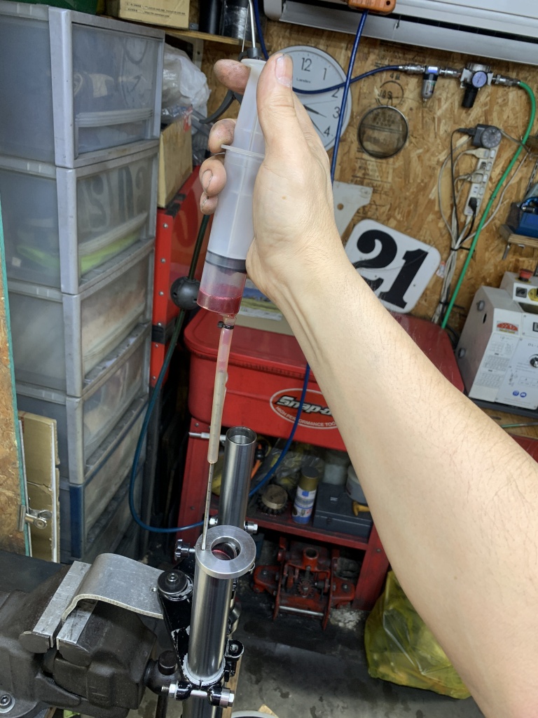 フォークが組み上がったら、規定量よりやや多めのオイルを入れます。