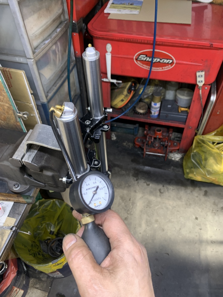 フォークキャップを取り付け、最後にエアを規定の中央値0.5kg/cm2に加圧し完成です。