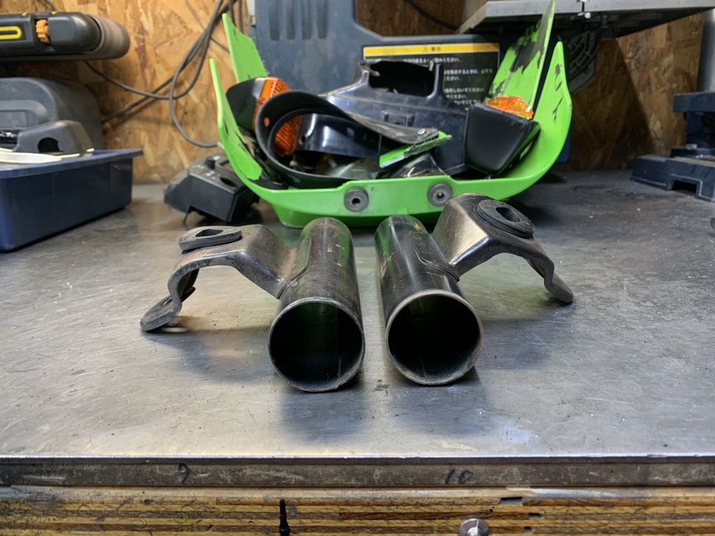 曲がったフロントフェンダーは、ウチのストックに交換します。純正新品で少しだけ使用感のあるものです。塗装も純正のまま。