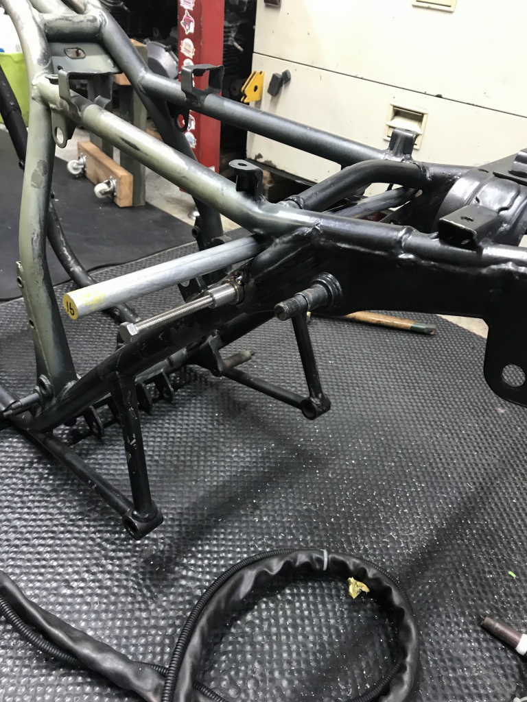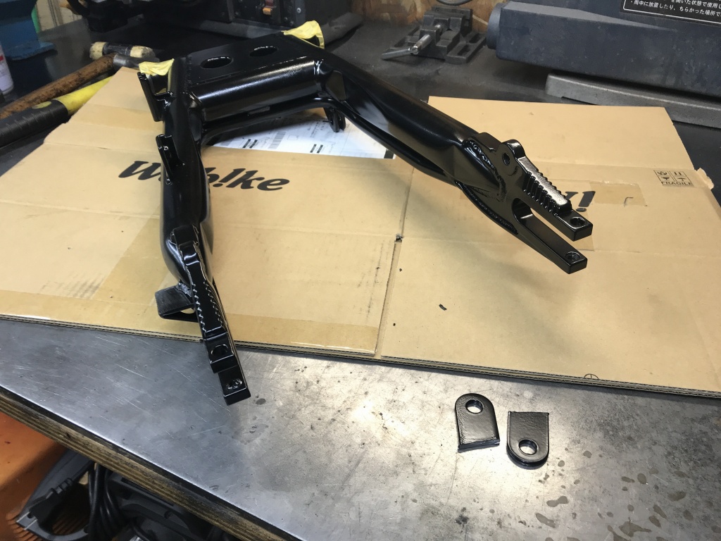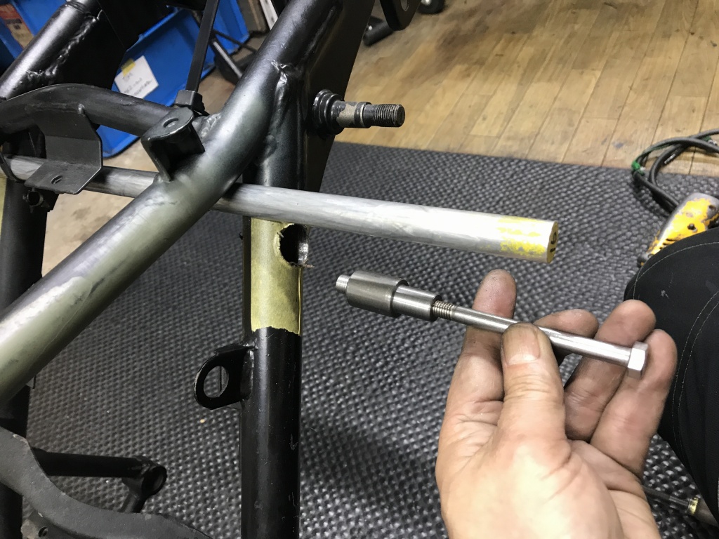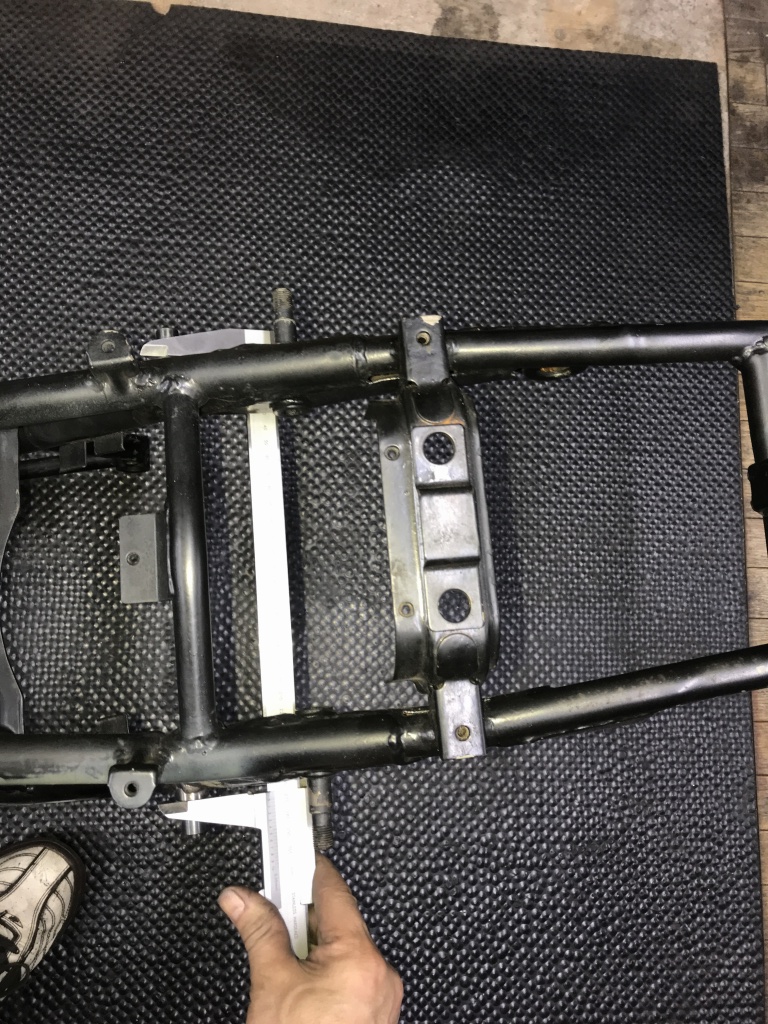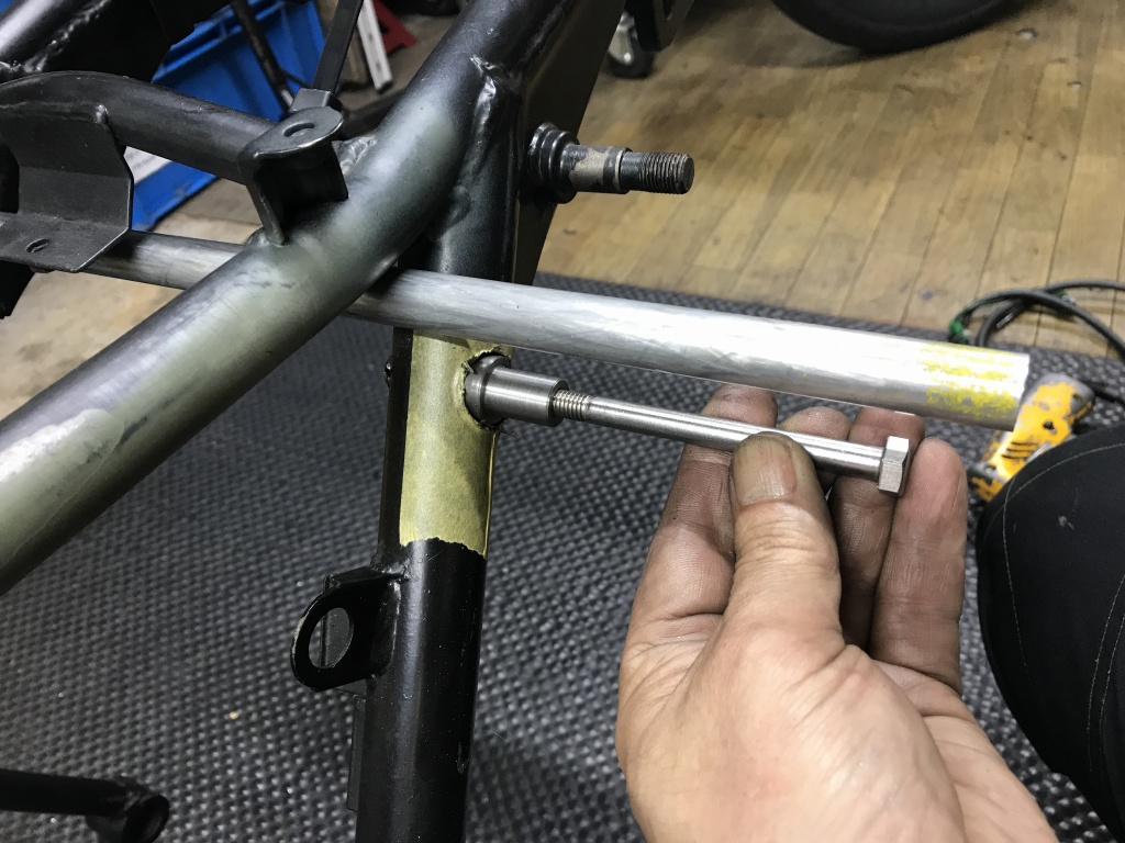 それに合わせてスイングアーム側のサス受けの幅も改修します。スイングアームはPMC製の鉄ワイドタイプですが、サス受けの幅は元々5ミリ広く作ってありますが、それを更に5ミリ広げます。