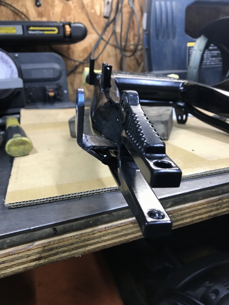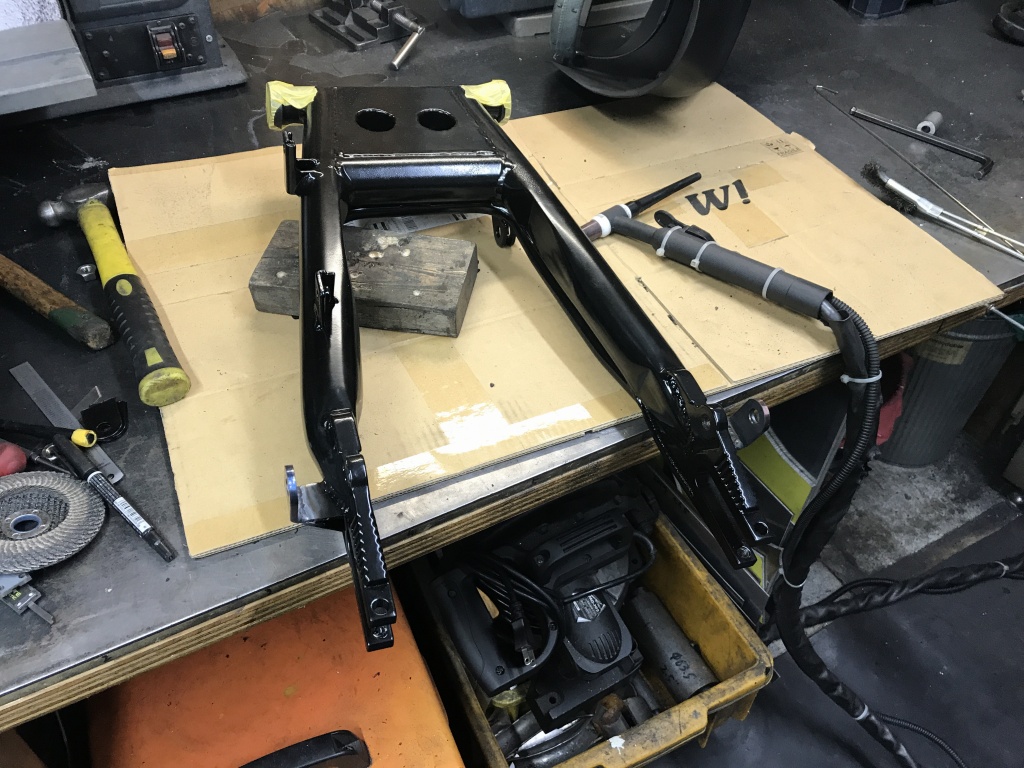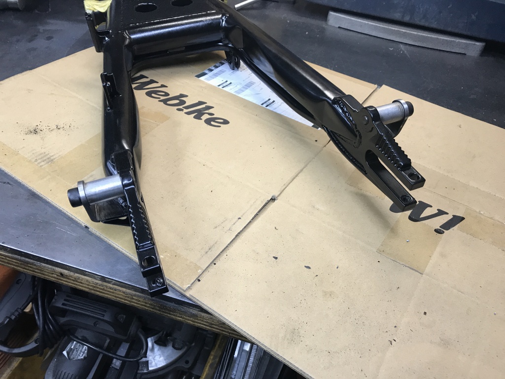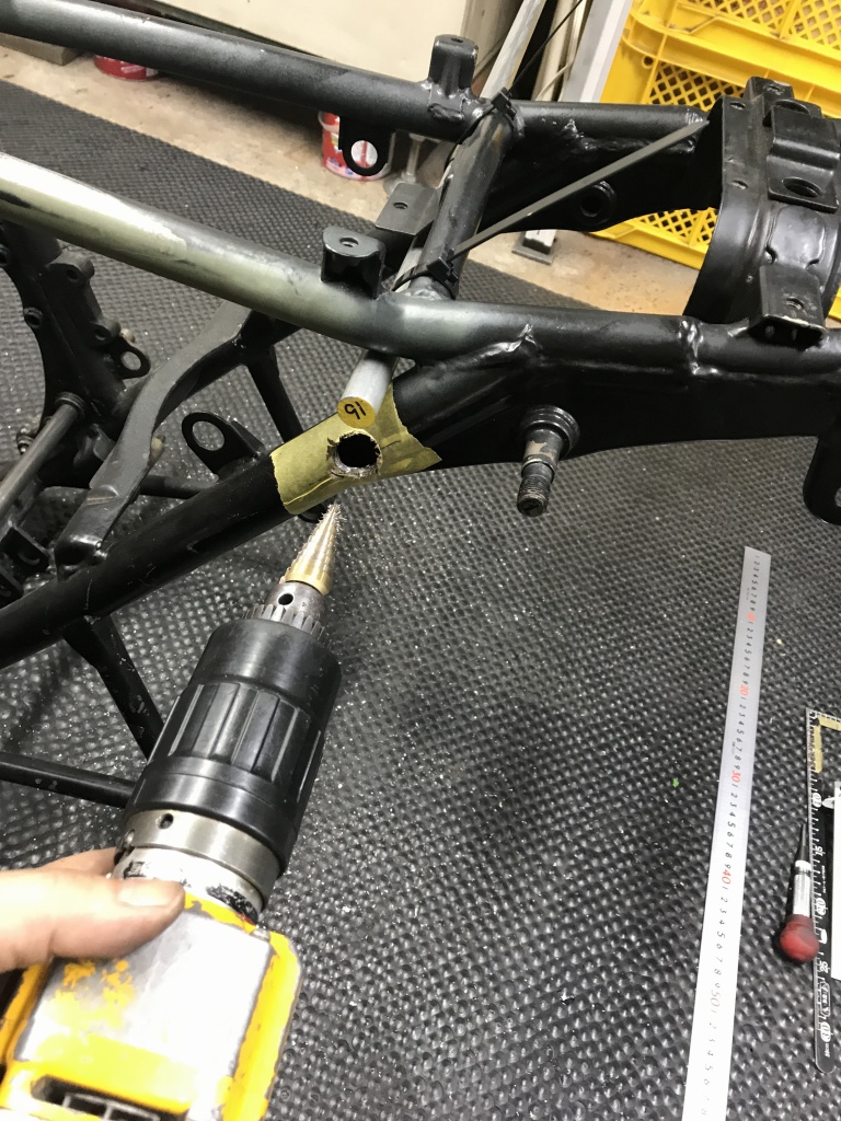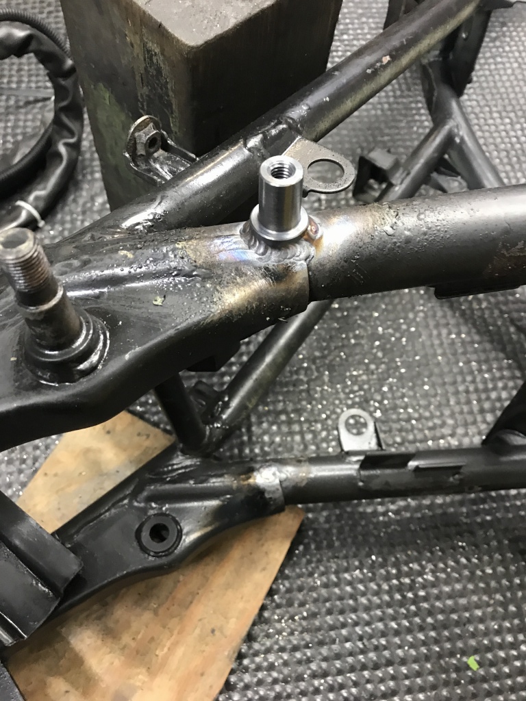 それに合わせてスイングアーム側のサス受けの幅も改修します。スイングアームはPMC製の鉄ワイドタイプですが、サス受けの幅は元々5ミリ広く作ってありますが、それを更に5ミリ広げます。