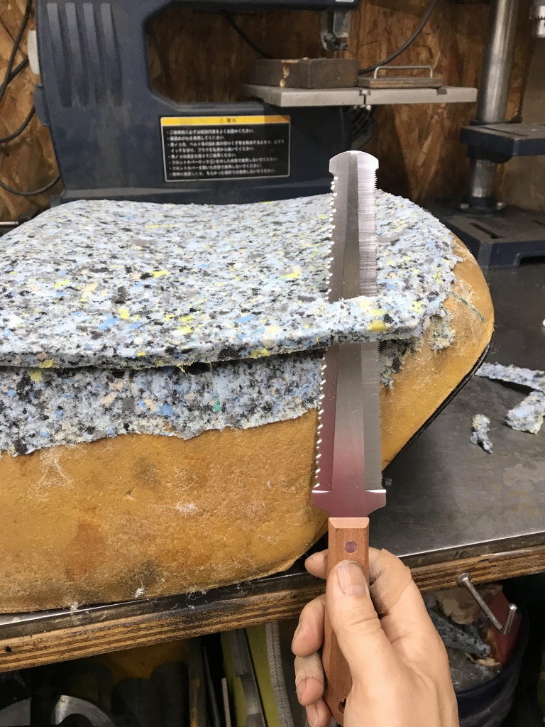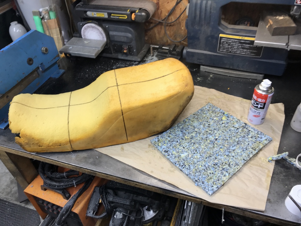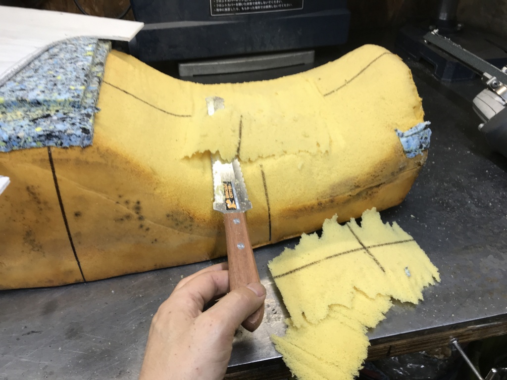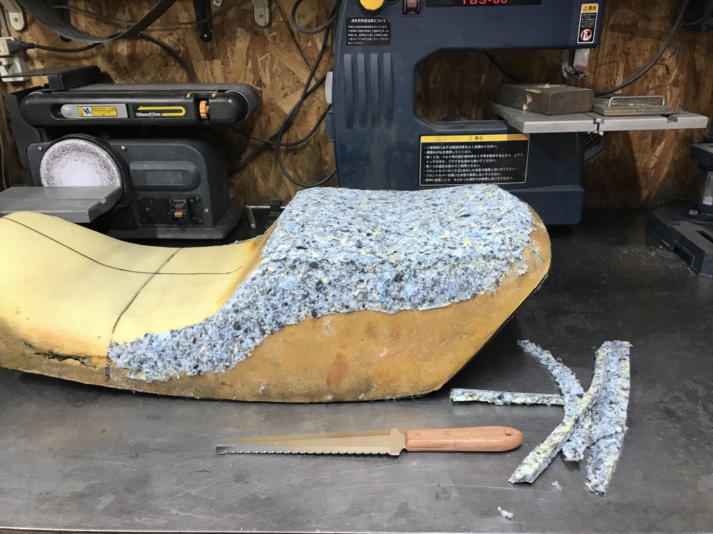 座面はアンコ抜きの量が少なく、あと15ミリほど削る必要があります。もともとこのスポンジはZ1100-B2純正シートを加工したもののようです。