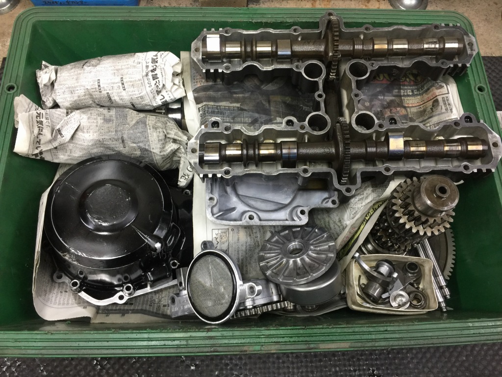 交換予定のクランクケースは手配できたので、先にエンジンカバー類のガスケット剥がしなど、大まかな洗浄作業を進めておきます。