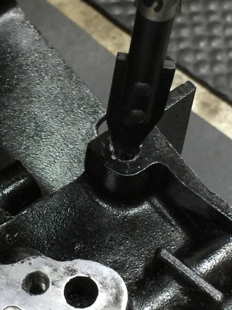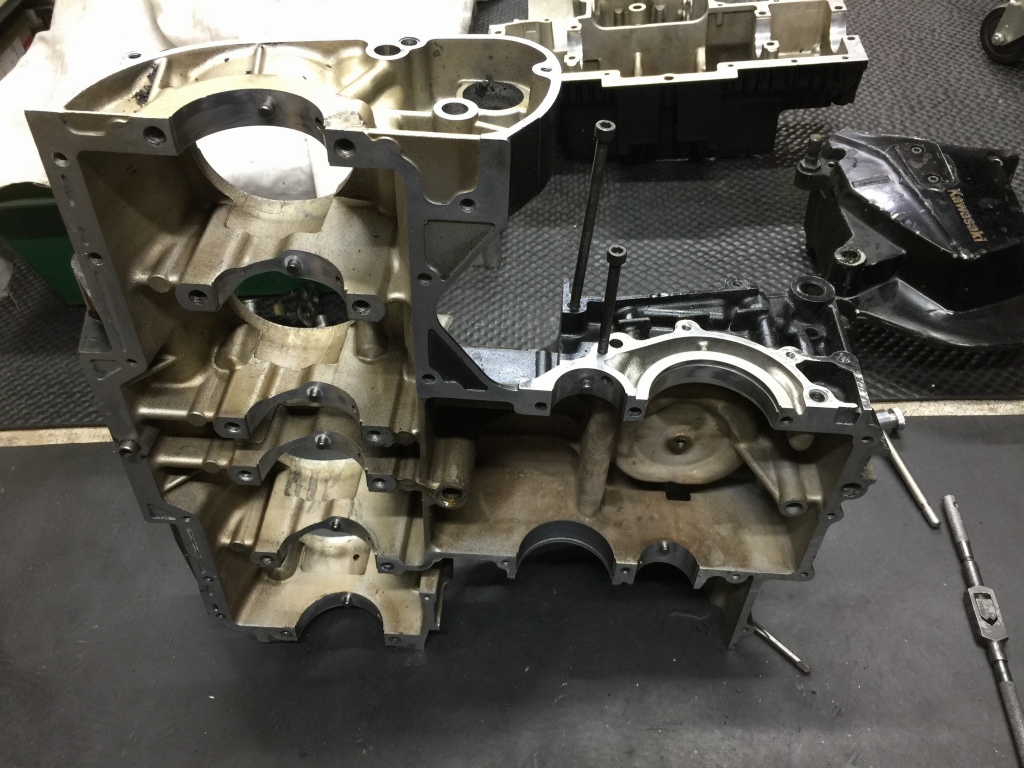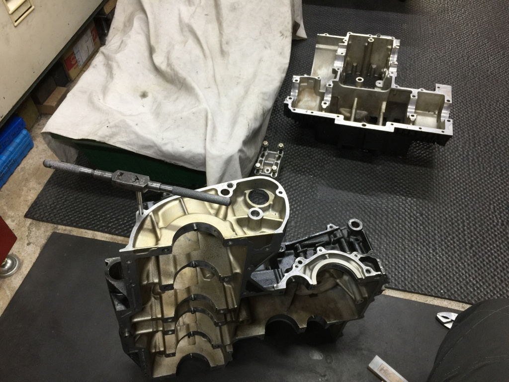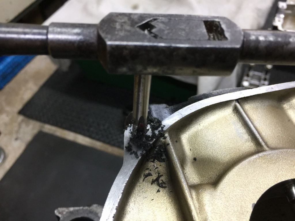 ネジ穴は全てチェックし、傷んでいるところや液体ガスケットが詰まっているところはタップをたてて修正します。
