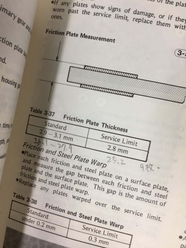 クラッチのフリクションプレートは9枚まとめて計測し、摩耗量を判断します。