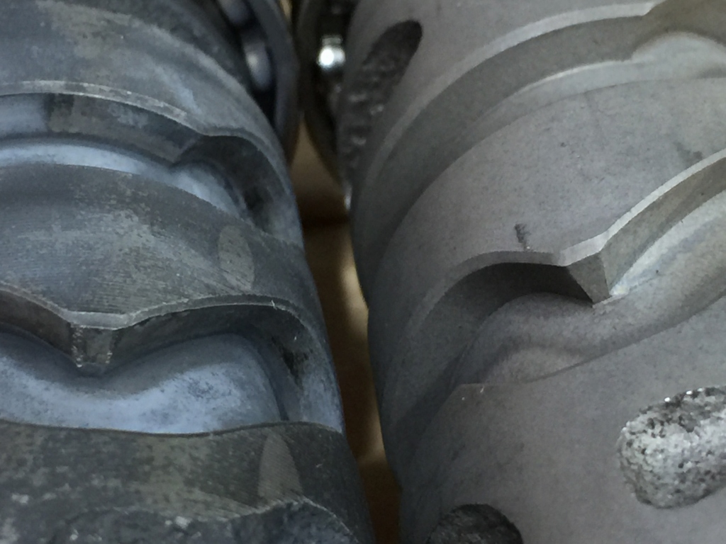 右が新品で、左の取り出した方は山の頂上の両肩が摩耗しているのがわかります。