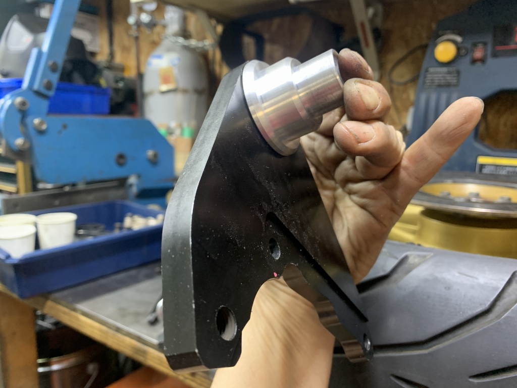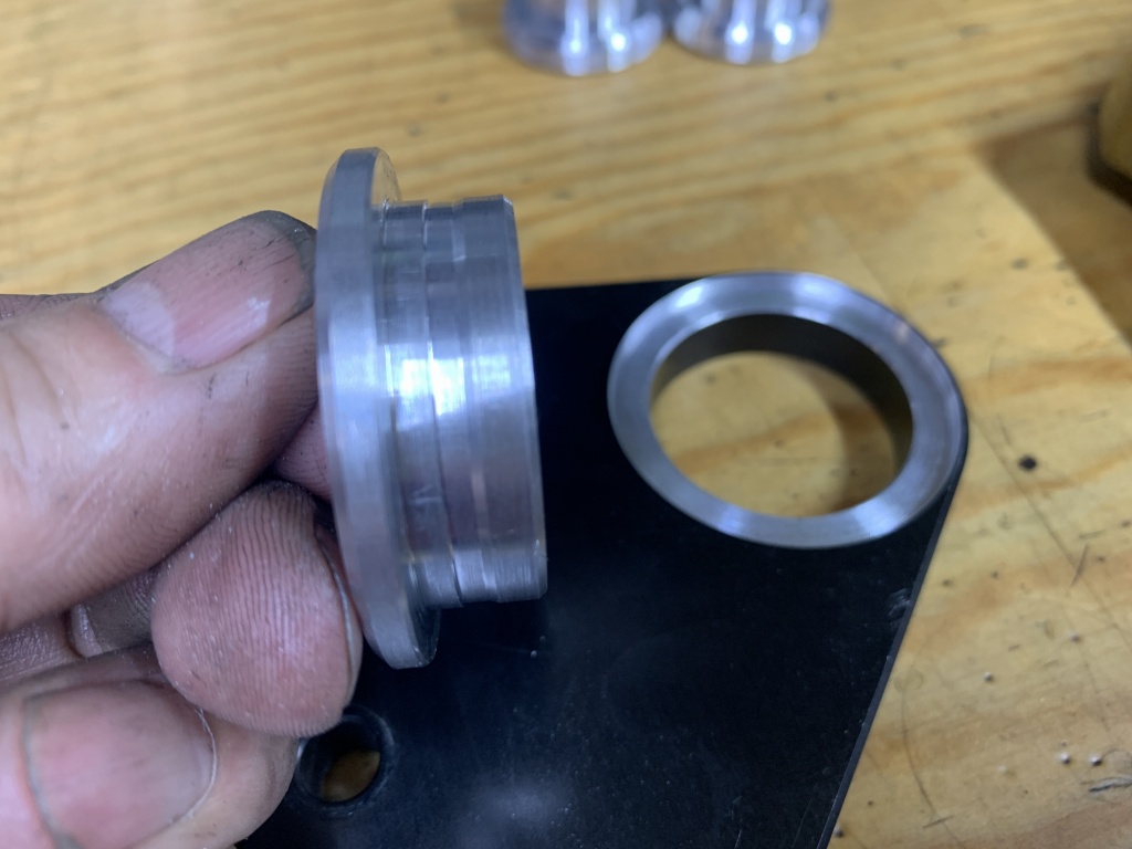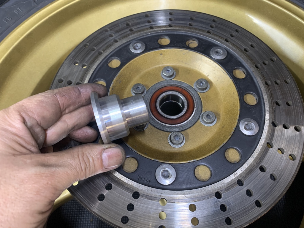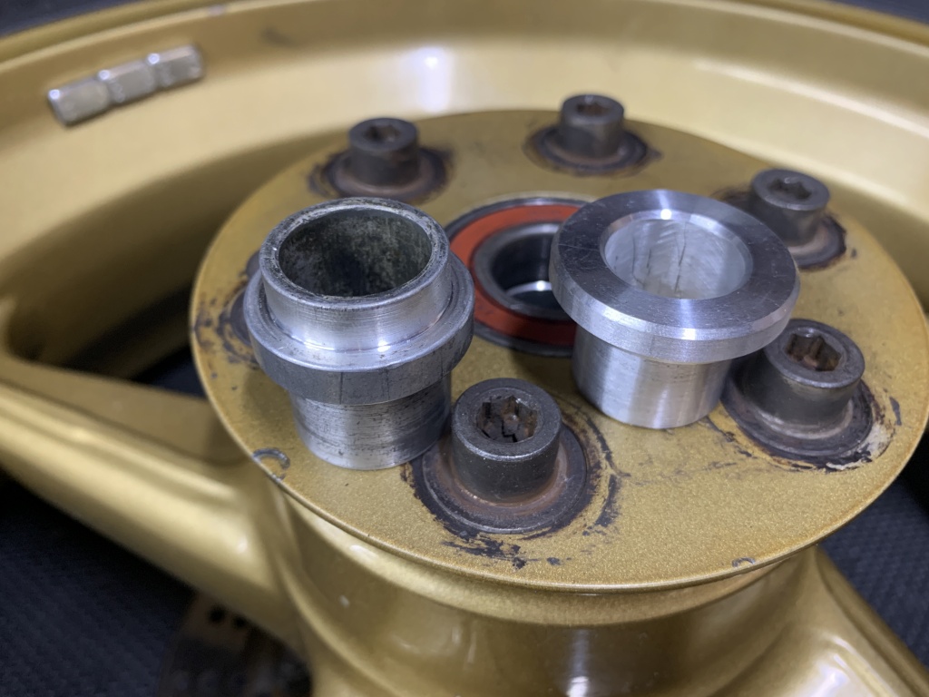 ホイールセンターを見直した関係でアライメントが変わり、サポートの軸受はこのようなツバ付きカラーになりました。真ん中の溝にグリスを充填して組付けます。