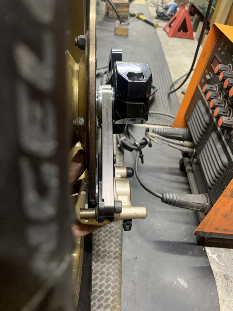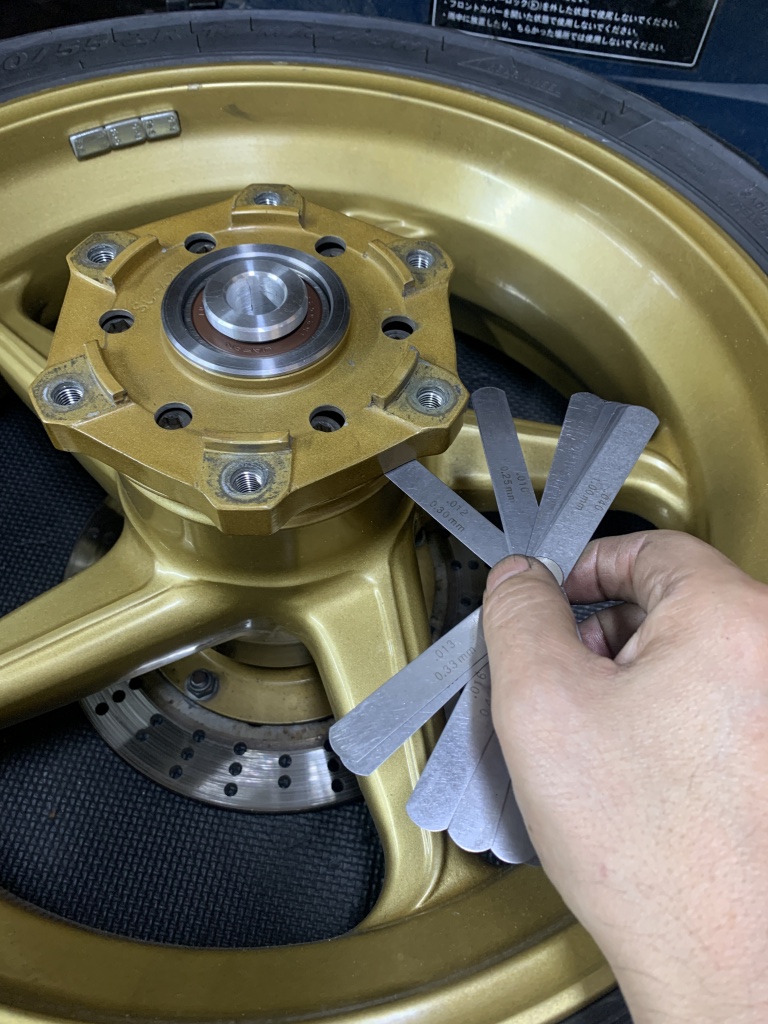 リヤキャリパーを取り付け、キャリパーとローターのセンターを確認します。