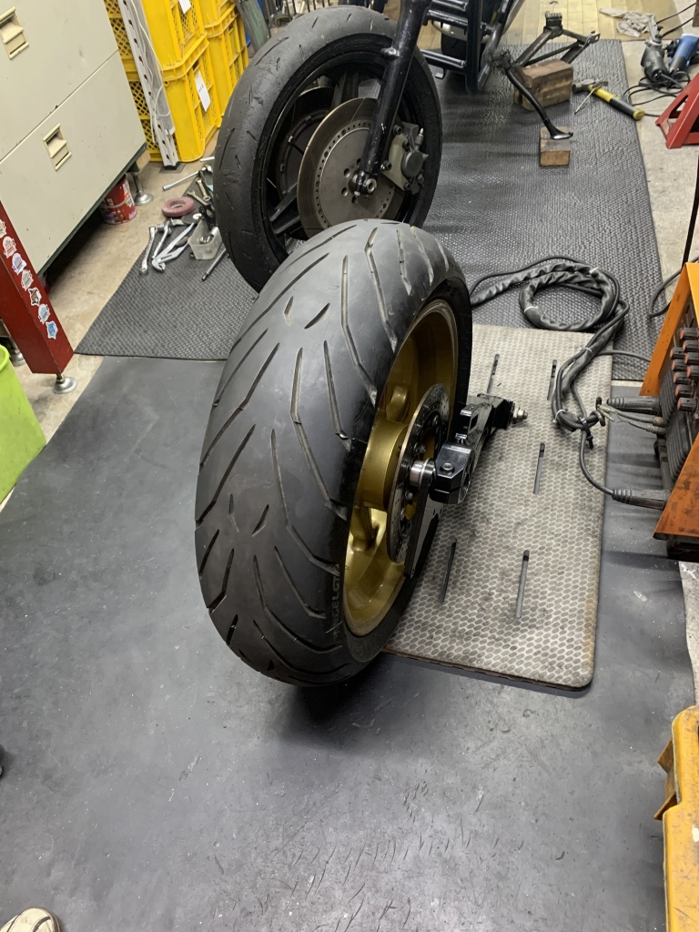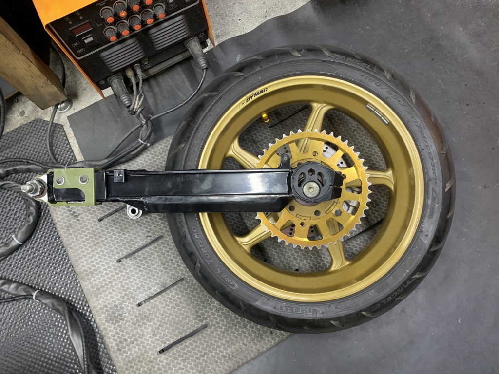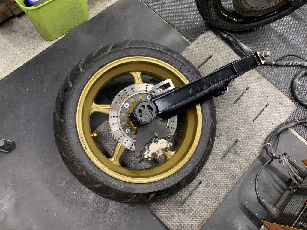 GPZ900Rのノーマルスイングアームに180タイヤの組み合わせなので、リヤスプロケット周りは非常にタイトなレイアウトとなっていますが、絶妙に成立しています。