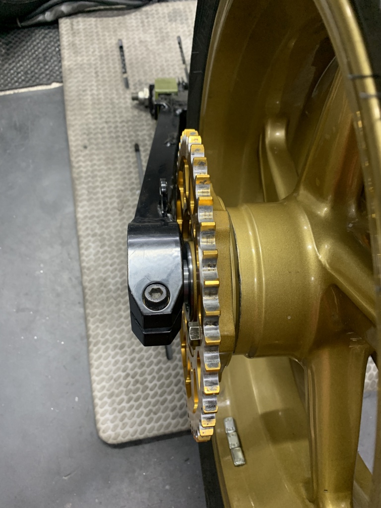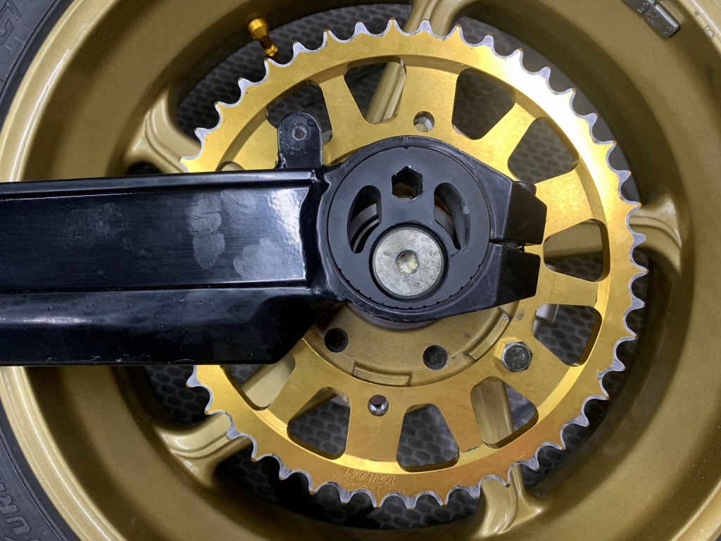 エキセントリックが中央のこの状態で、スプロケの刃先や取付ボルトはスイングアームとギリギリです。