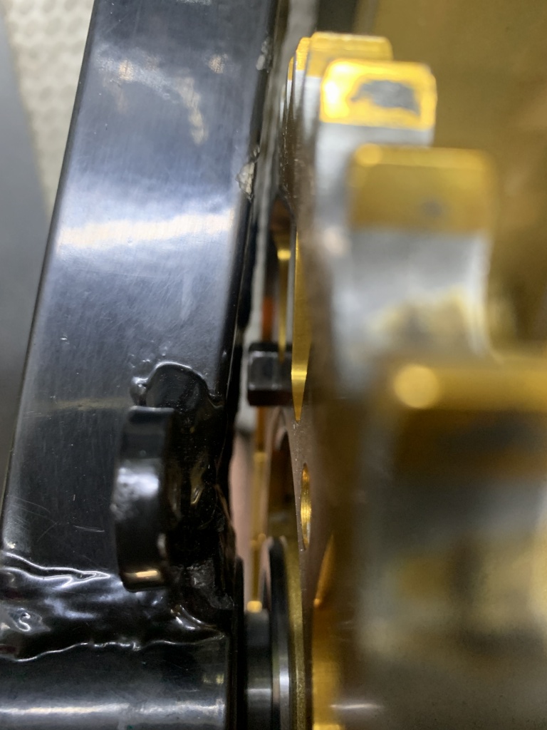 スプロケキャリアを乗せ、クリアランスを測ります。少し長めに作ってあるので、現物合わせでこのクリアランスが0.2ミリ位になるよう、先ほどのカラーを削って調整します。