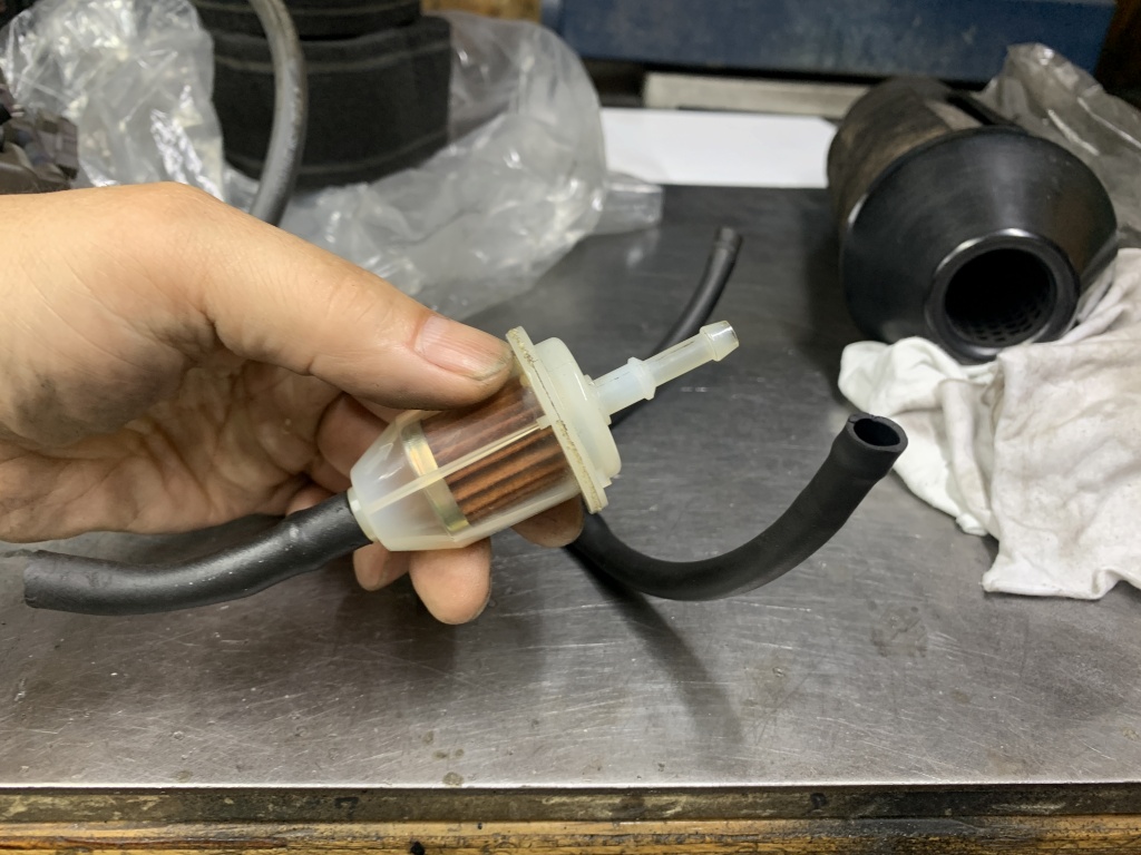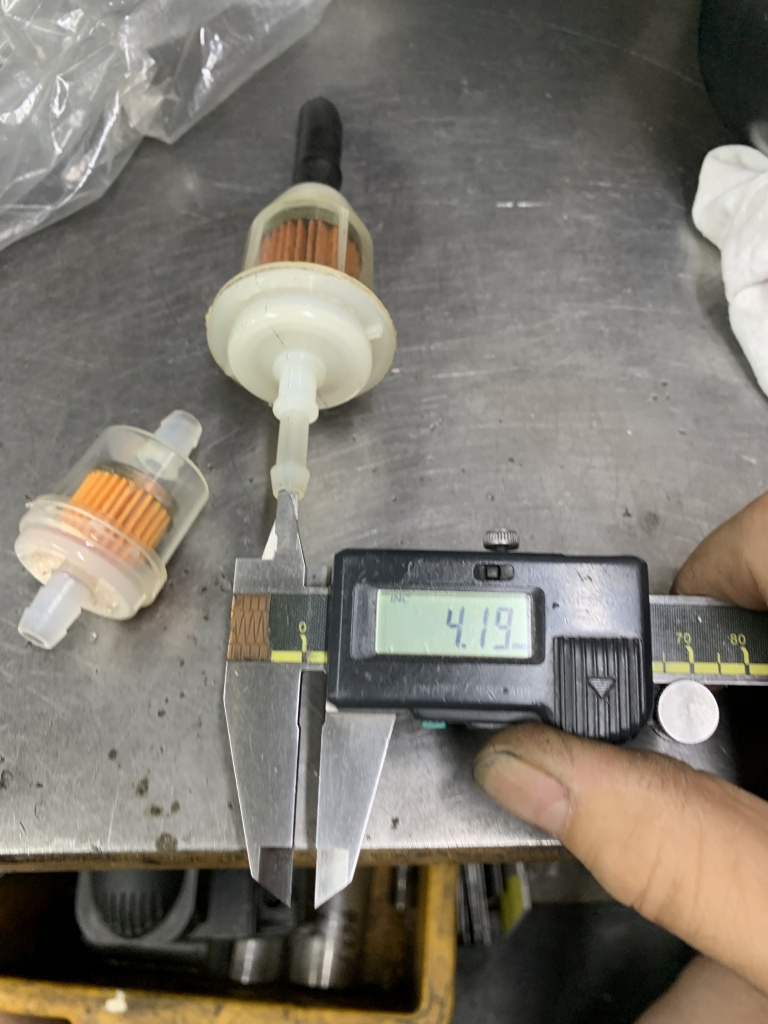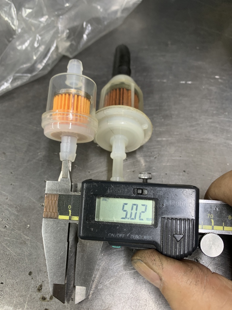 ちょっとここでもともと付いていたフューエルフィルターについて。このフィルターは適合ホースが細いのと太いののダブルになっていますが、太いホースを使っているのに細い口を切断しないまま太いホースで使われていました。
