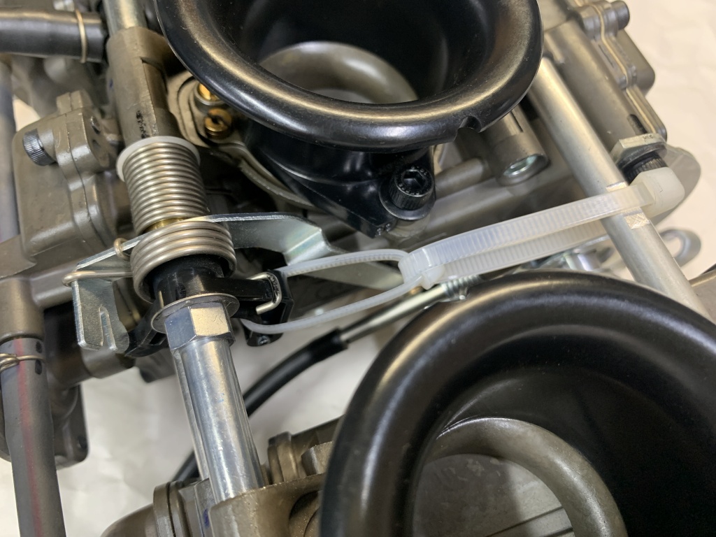 加速ポンプはスルットル開け始めから直ぐに作動する仕様なので、キャブセッティングの初めはポンプレバーをタイラップで固定し、ポンプを不作動にしておきます。