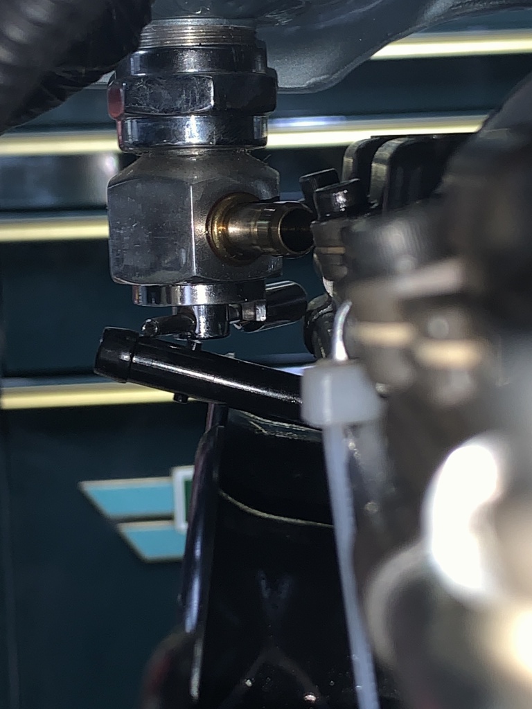 タンクを載せてみると、コックとキャブの干渉が明らかに。コックの向きを変えるだけでは干渉を回避できません。