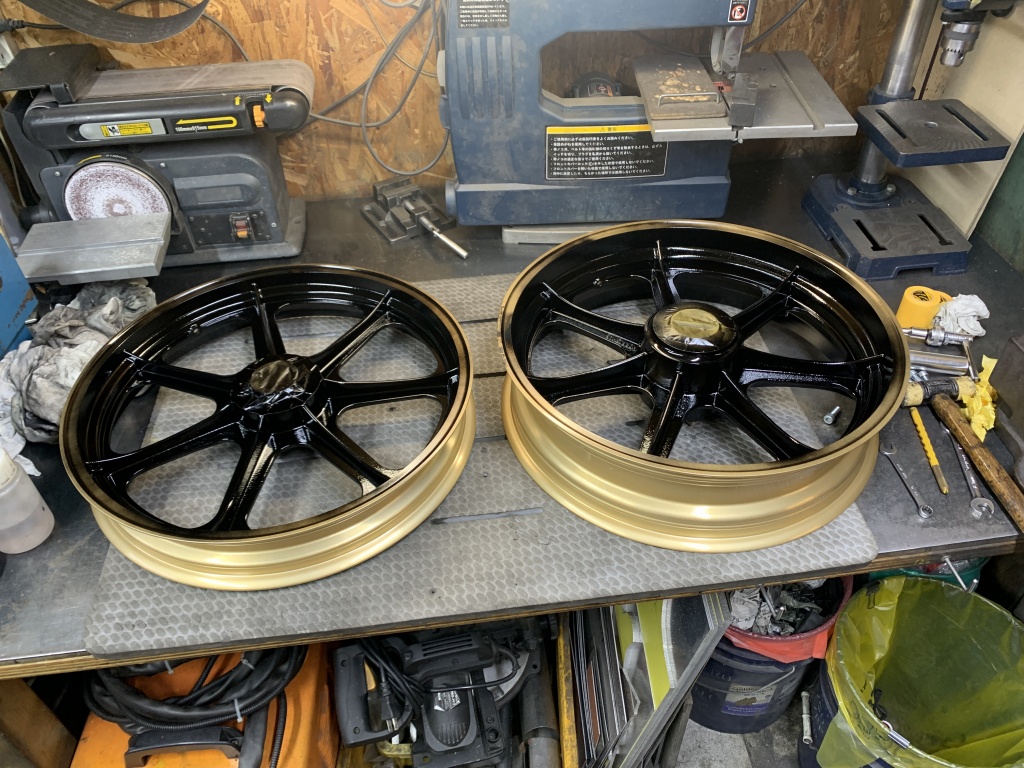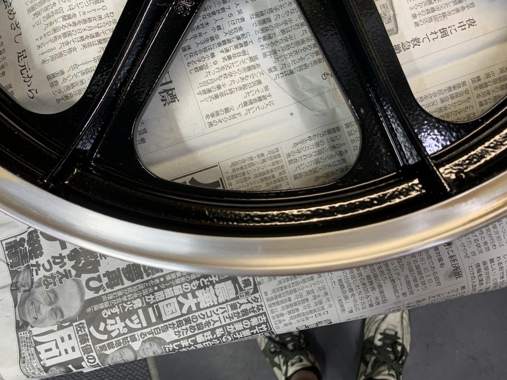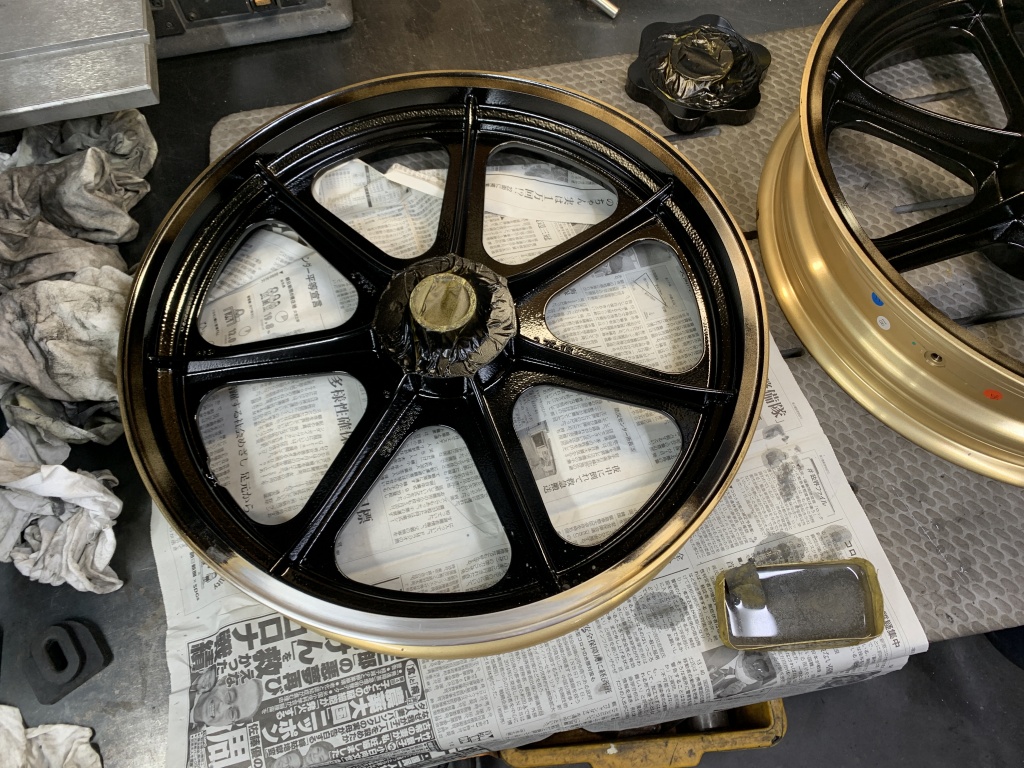 耐水ペーパーで水研ぎし、リムのゴールド塗装を剥がします。