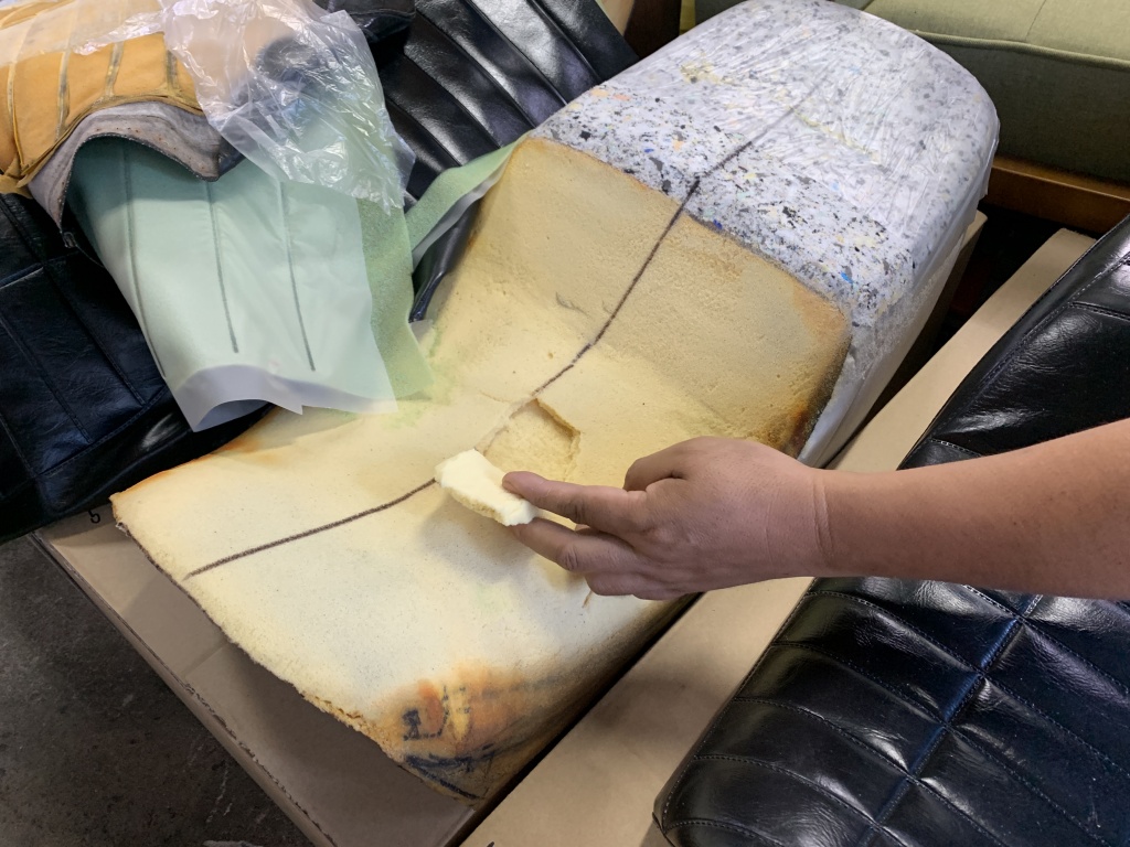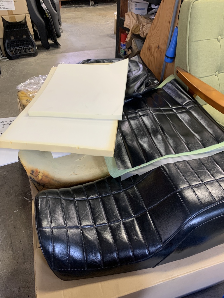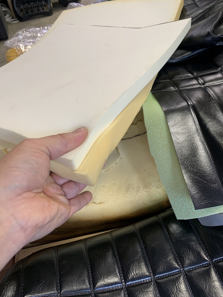 トゥーズカスタムさんオリジナルのスプリームシートに使う専用のスポンジはこちら。上がハードで下がソフトです。低反発でもなく高反発でもなく独特な感触。なぜか高野豆腐を連想しました。外側は上面から側面に至るまで全面にこのハードスポンジを敷き詰めるので、持ち込んだ加工済みシートのスポンジは厚く一皮むかれるとのこと。
