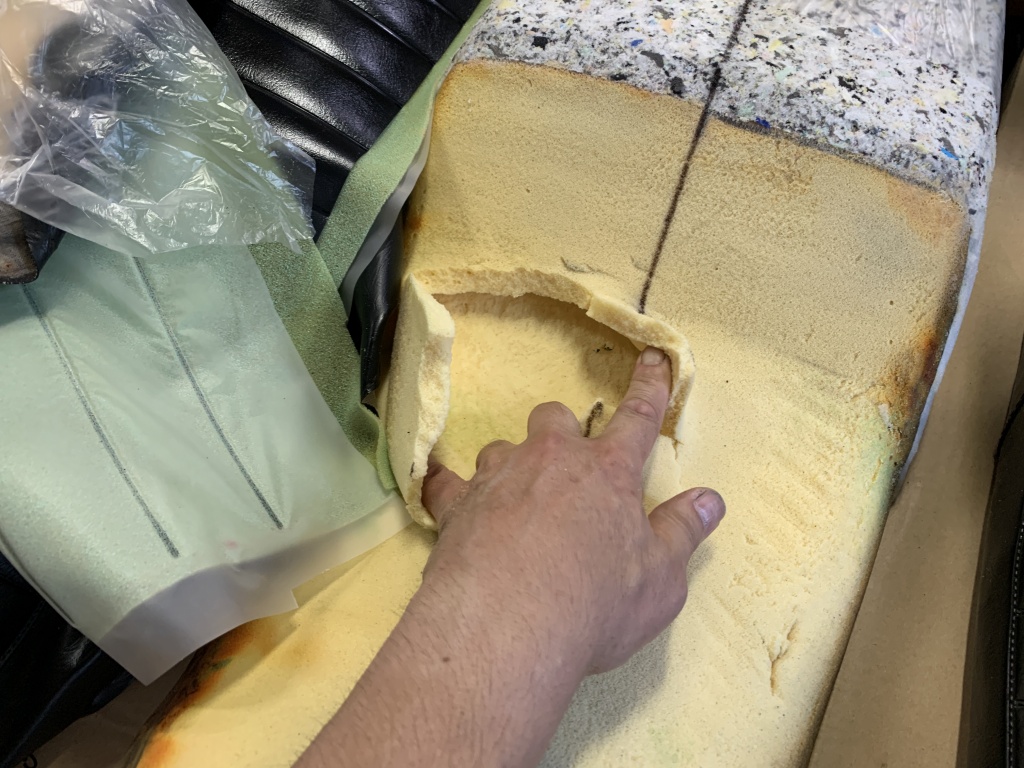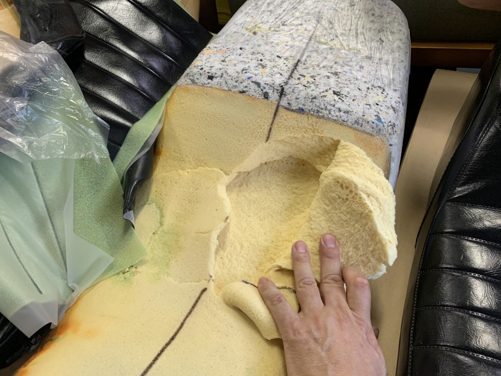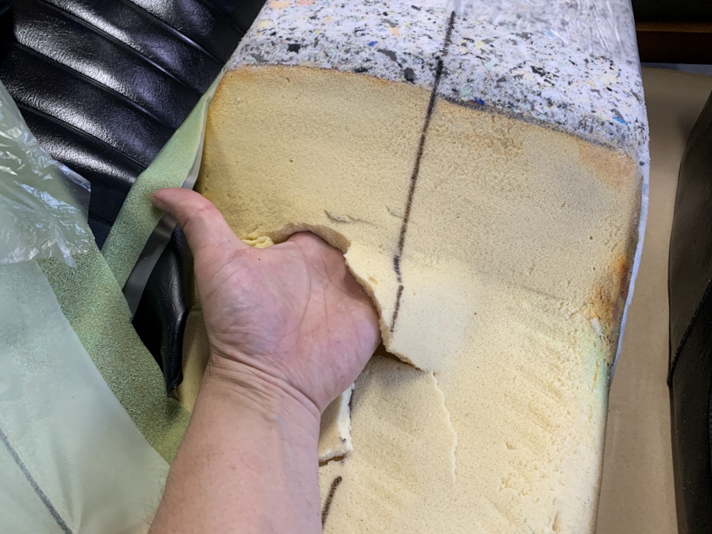 これは、製造時のガス抜きの際の行程に問題があると発生する欠陥だそうです。その他、外側の劣化したスポンジ層なども全て削り取って置き換えるとのこと。純正スポンジはシートベースと接しているわずかな厚みを残して広範囲にスプリームシートスポンジに置き換わることになりそうです。
