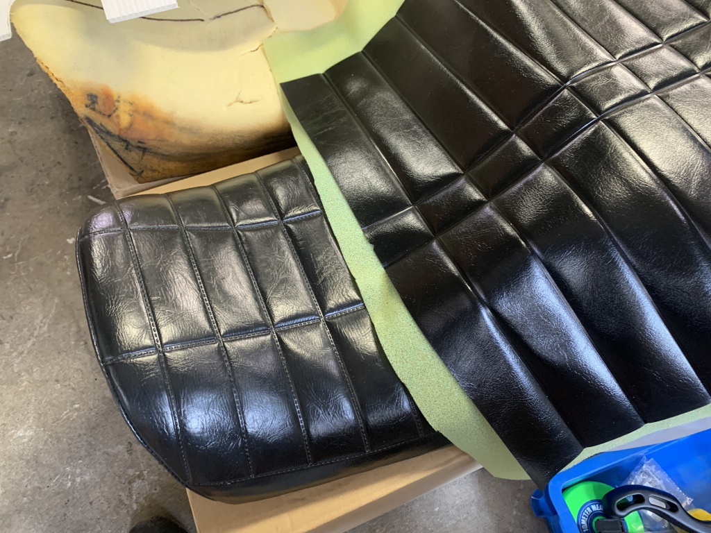 表皮は一番近いタイプのこちらを使用します。某国産大手ゴムメーカー製で、バイクシートに適した性能を有したビニールレザーです。バイクメーカーも純正採用しています。