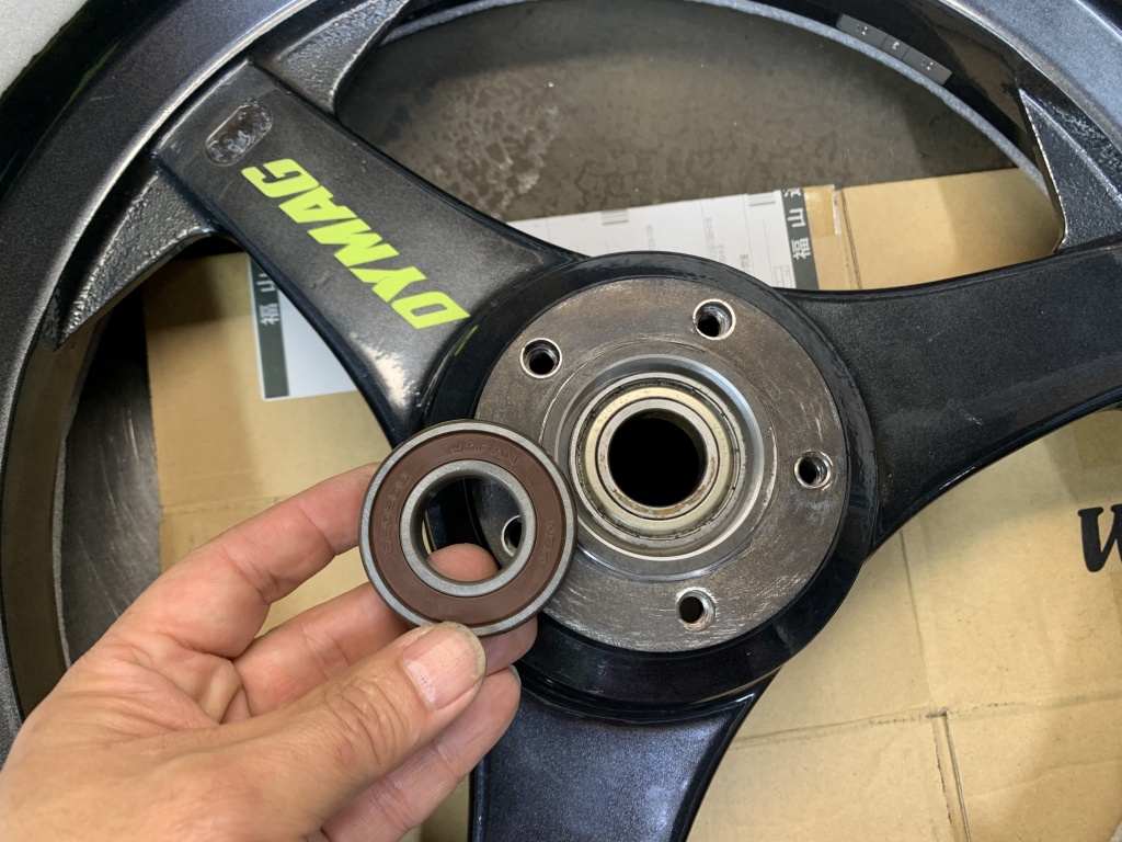 新しく使用するベアリングはこちら。防水性を考慮し、接触ゴムシールタイプに変更。内径は同じなので今までのカラーが使えます。