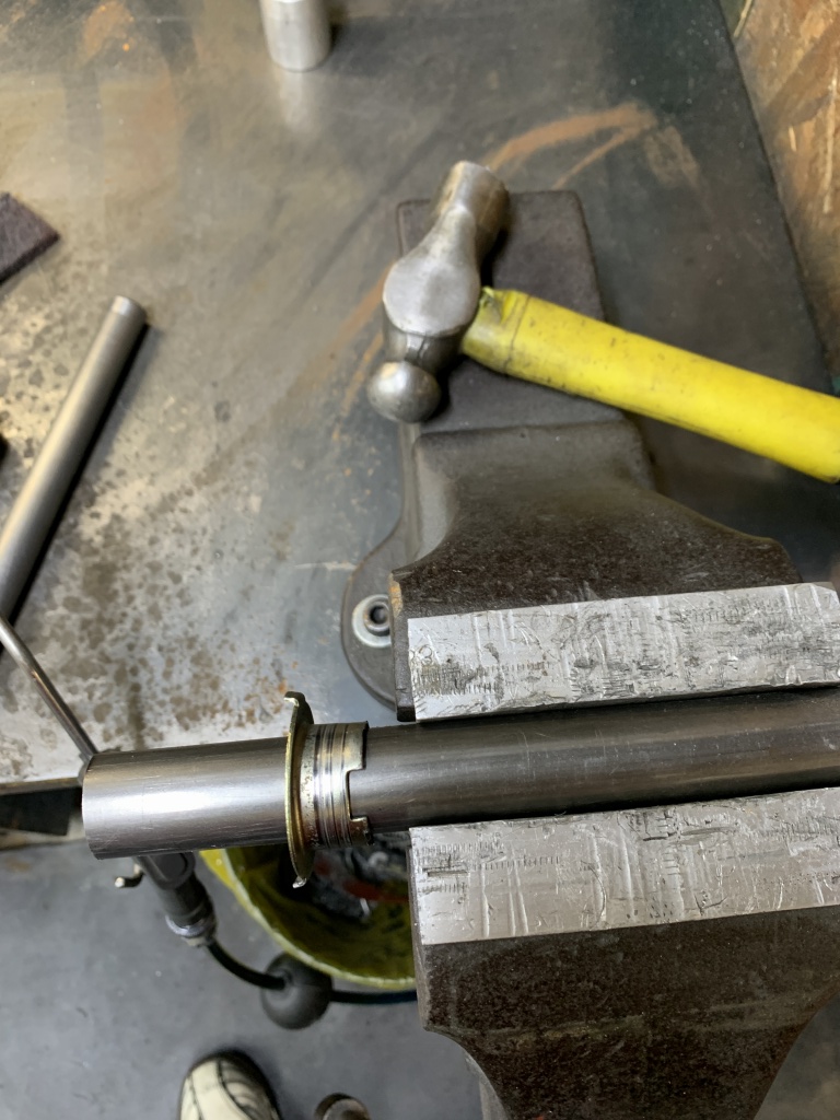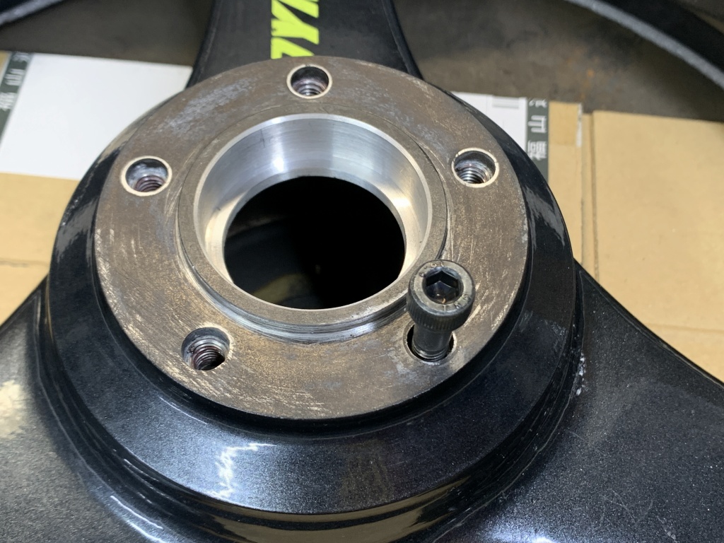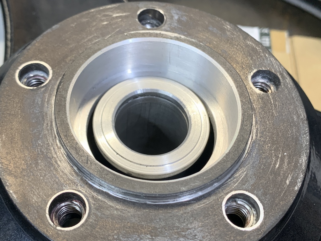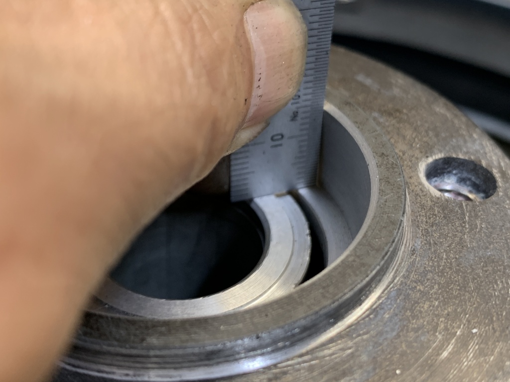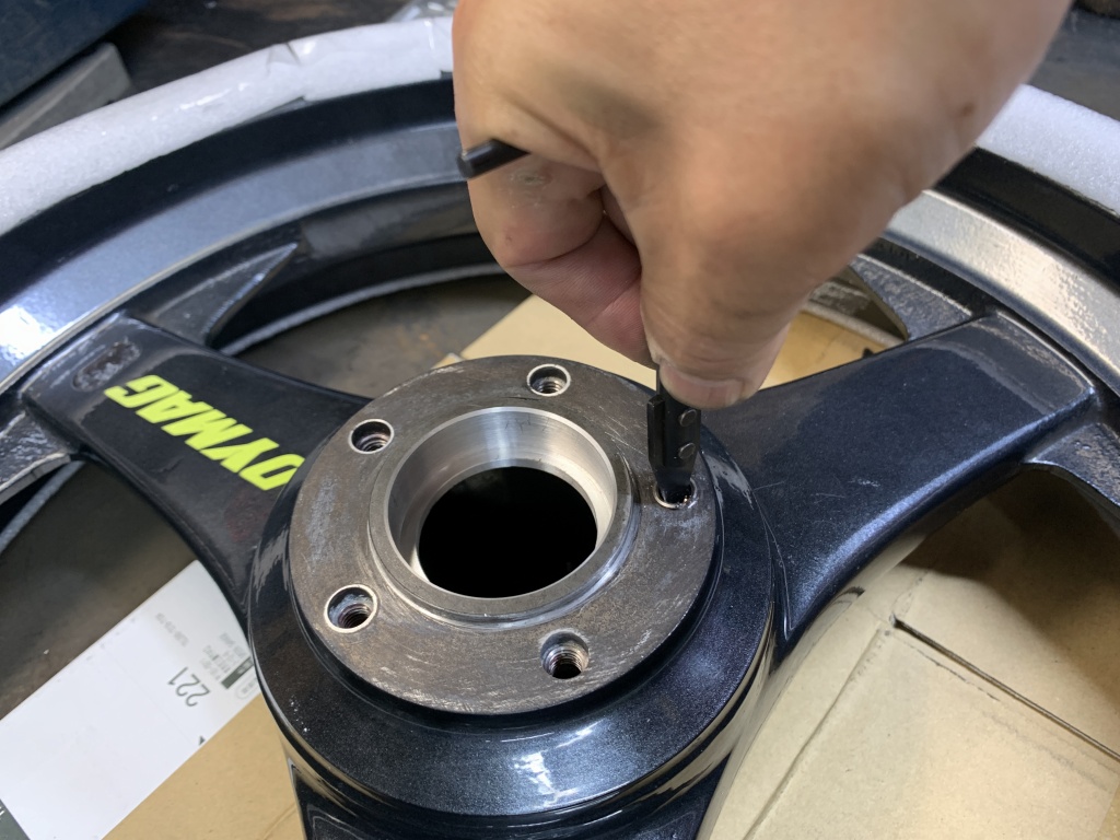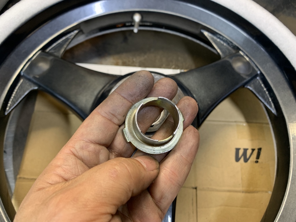 ホイール側より極僅か高くしておきます。ここが一番肝心なところです。ここのベアリングは内輪と外輪を同時に押し、内輪がディスタンスピースに当たったところで止めます。この加減を間違うと、ベアリングに過大なプリロードが掛かり、また外輪がスリップするようなことになるので取り扱いにはご注意を。
