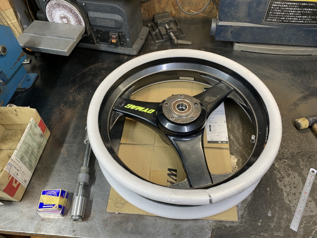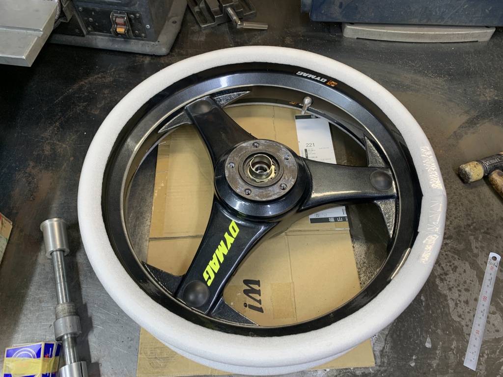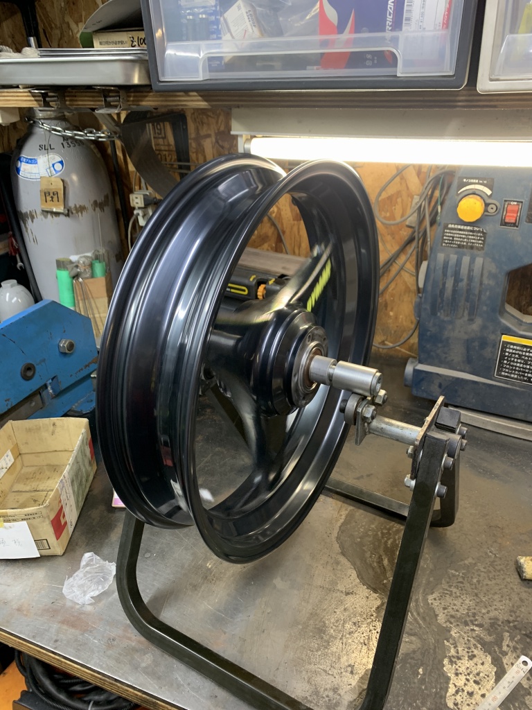 シャフトを通して回転させ、振れが無いことをチェックします。1ヶ所リムが2ミリほどめくれていますが、実用上特に支障はないでしょう。