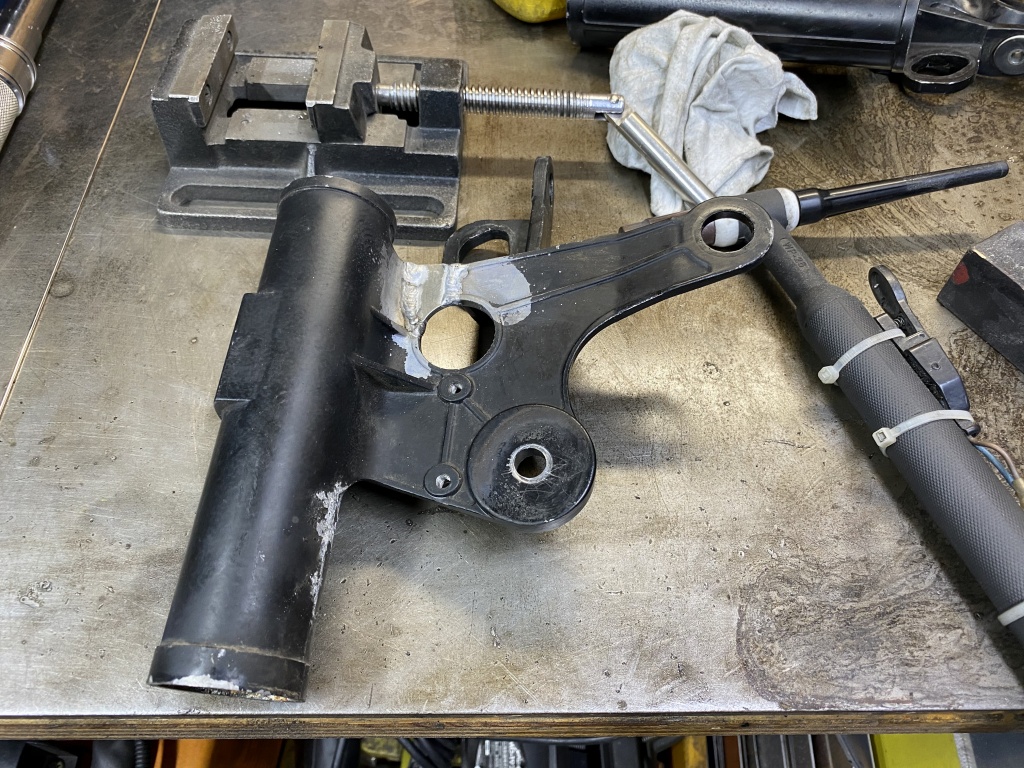 左のライトステーの欠けですが、曲がりは修正できたので欠けた部分をアルミ板で切り出し、溶接して復元します。