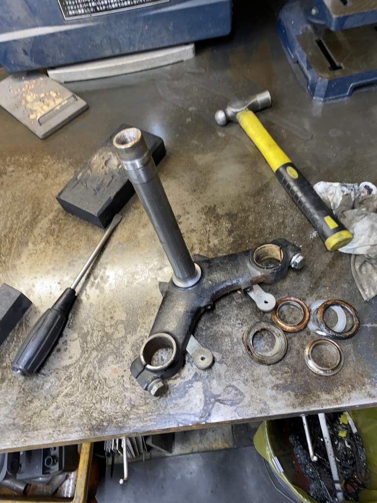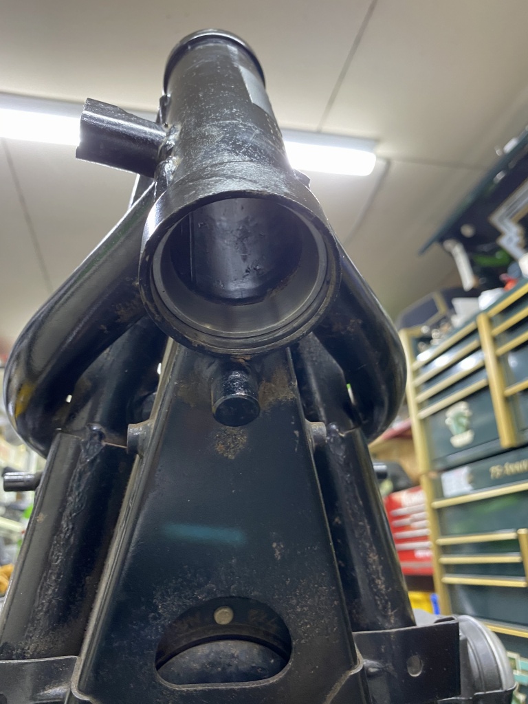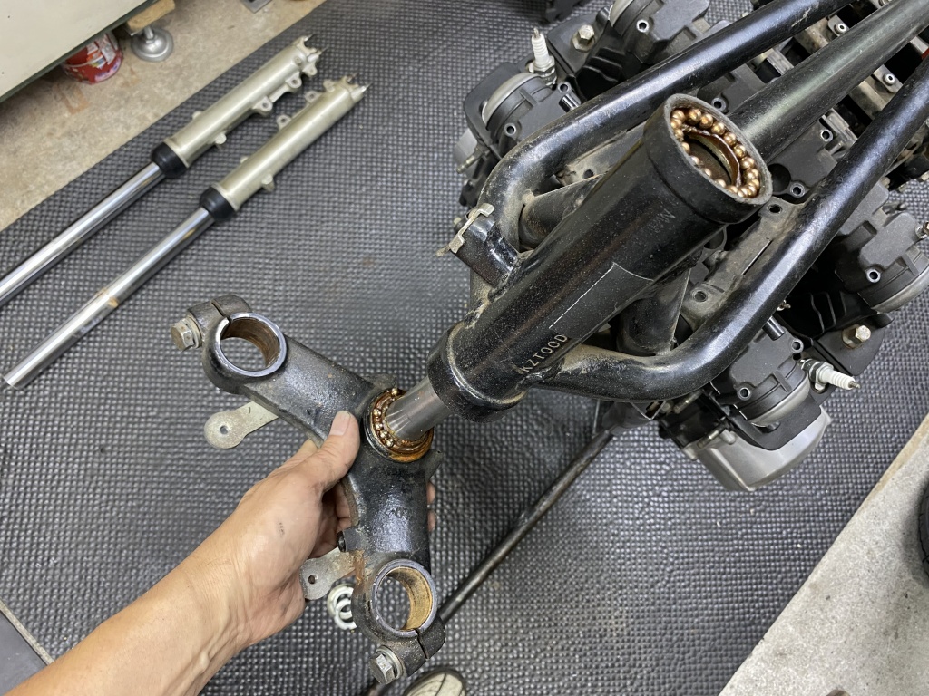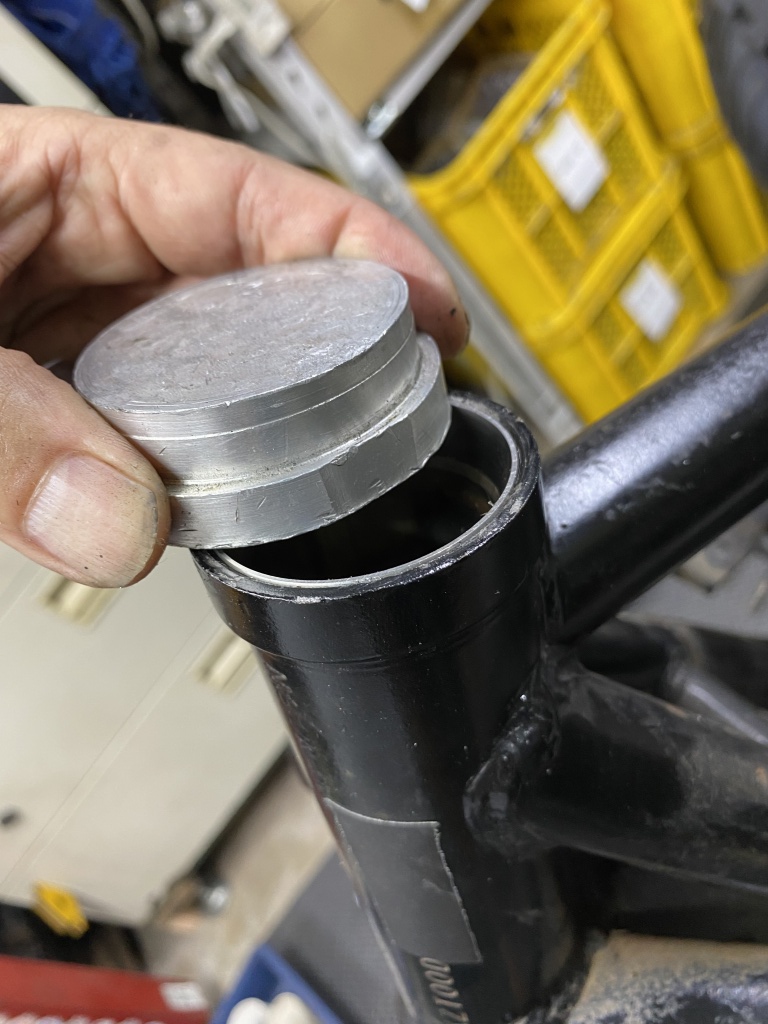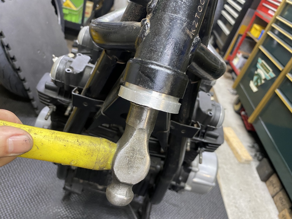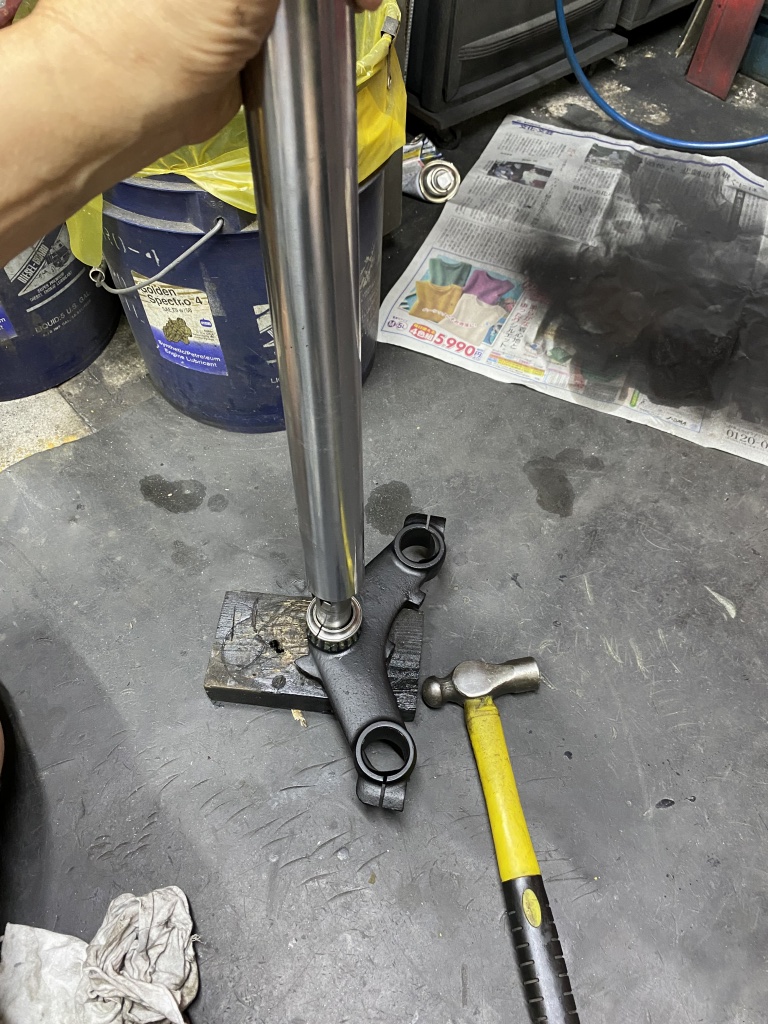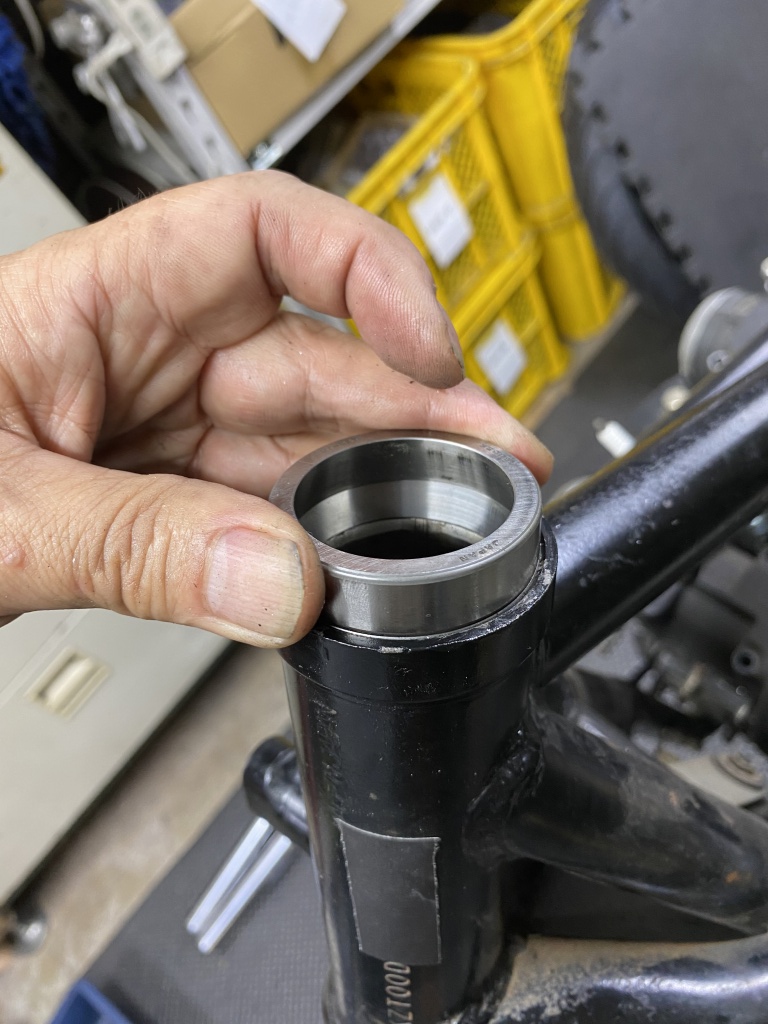 ステムベアリングは新しくテーパーローラーに交換します。アウターレースを圧入しますが、アッパー側は深さに要注意。たいていはフレームの面より奥まで入るのでここで止めてはいけません。