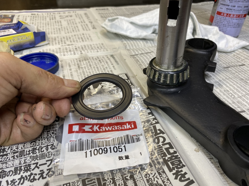 テーパーローラーは純正のダストシールが適合しないので、いつものようにタンクキャップのパッキンを流用します。