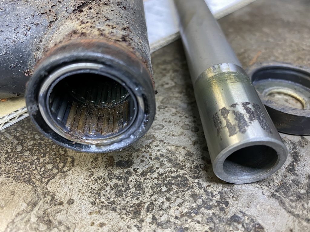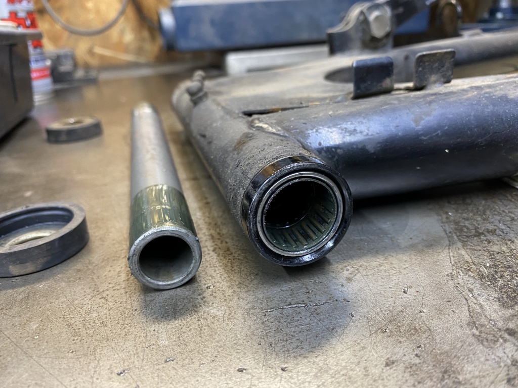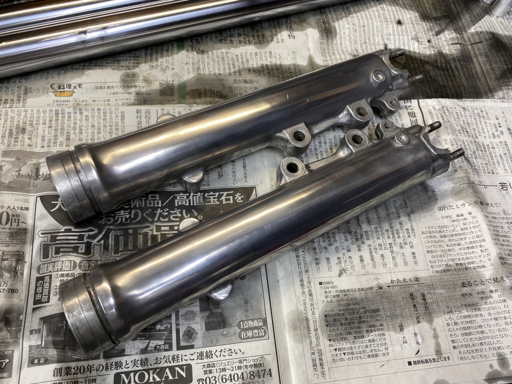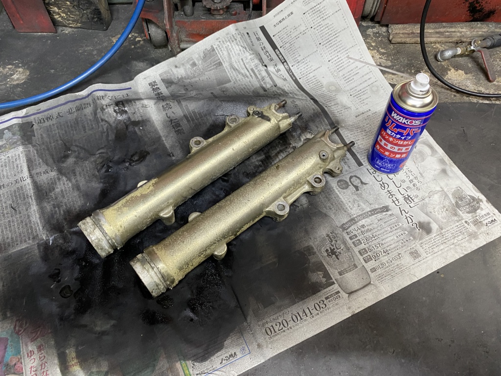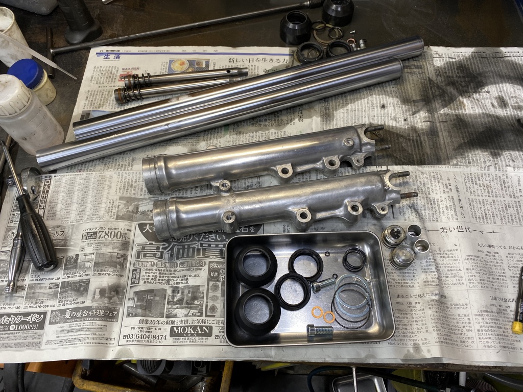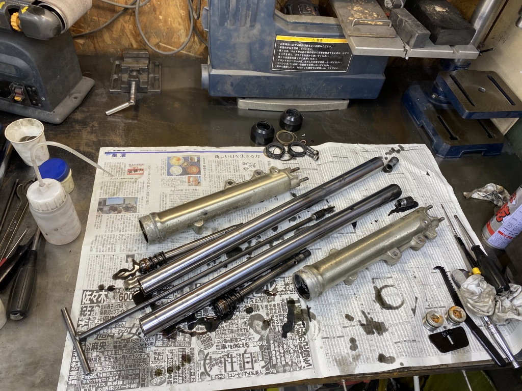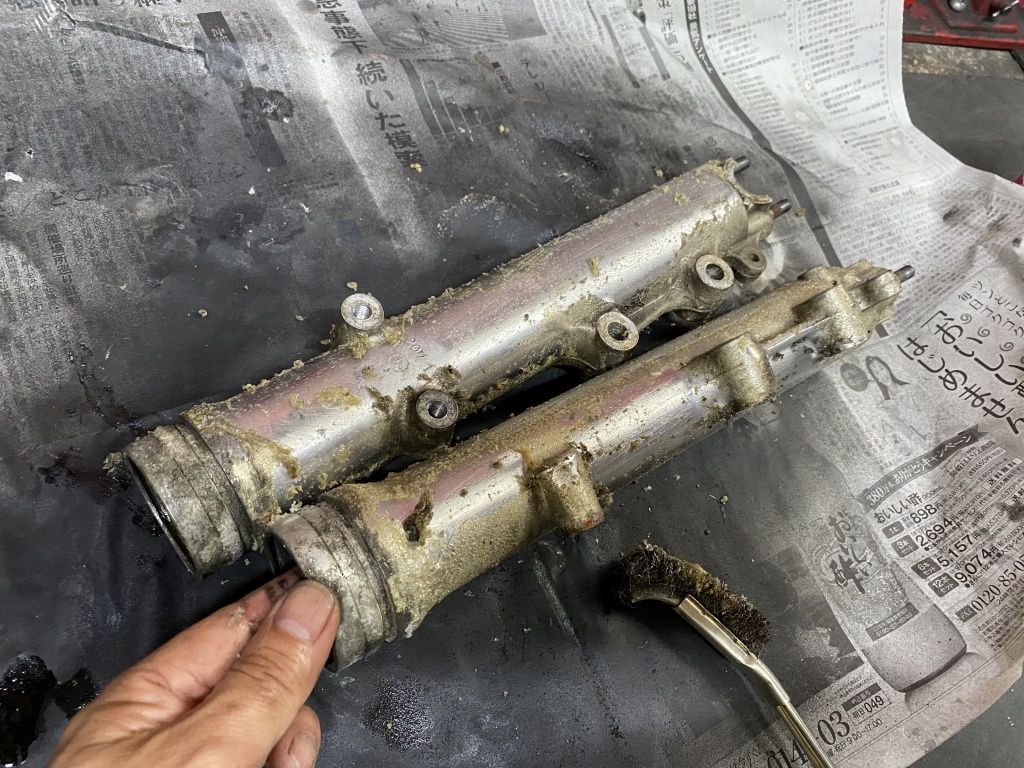 フォークを分解点検します。インナーにサビやキズはありますが、摺動部分ではないので良しとします。