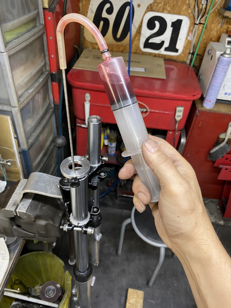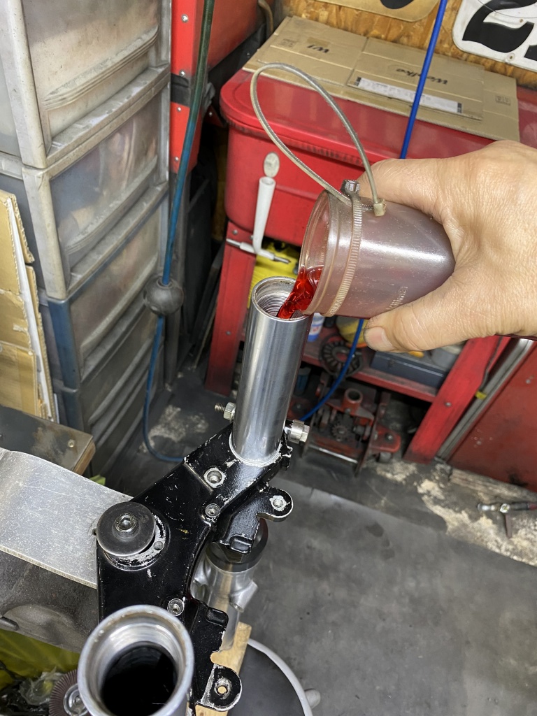 規定よりやや多めにフォークオイルを入れます。