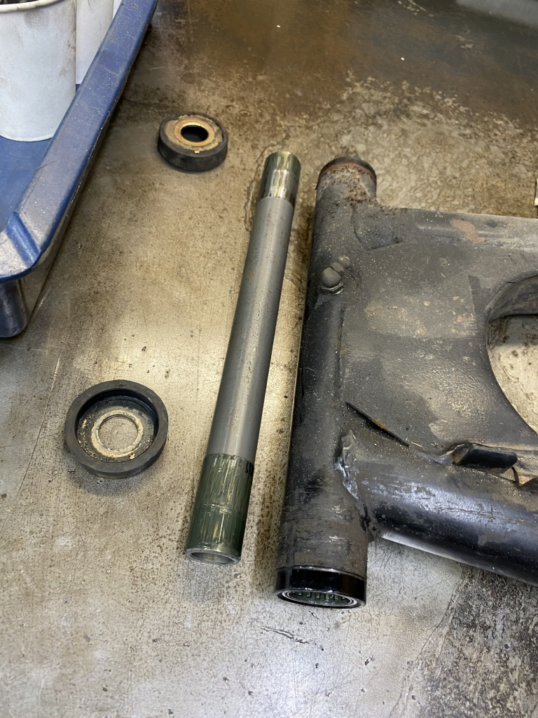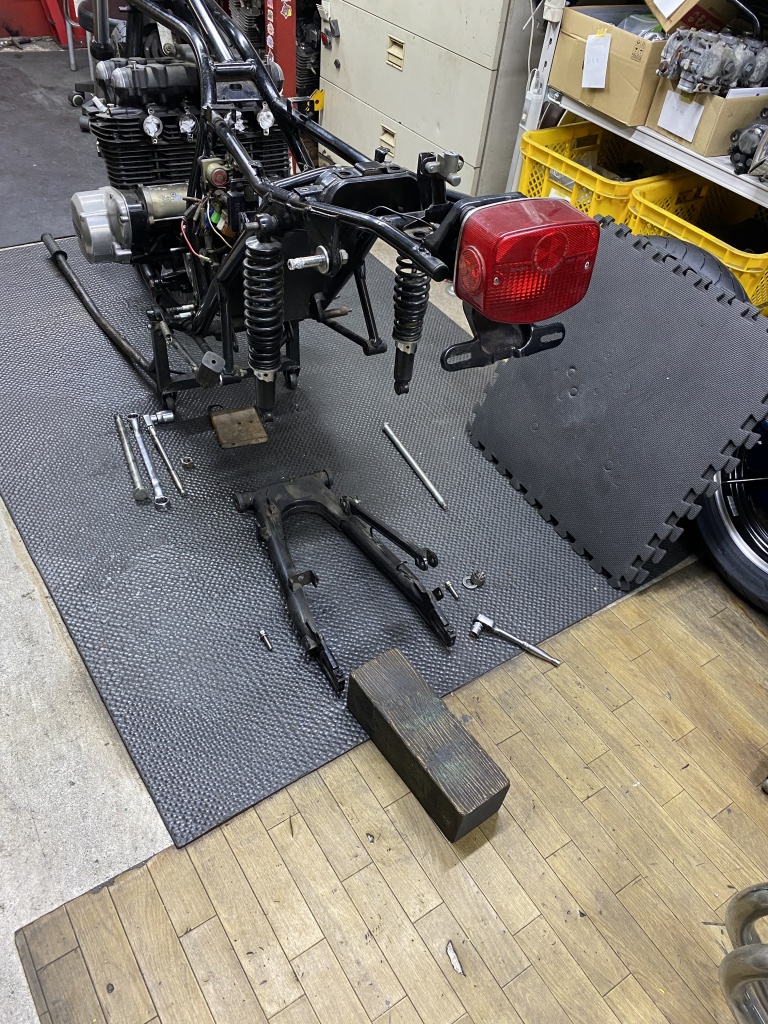 続いてリヤ周りへ。スイングアームを外して点検します。