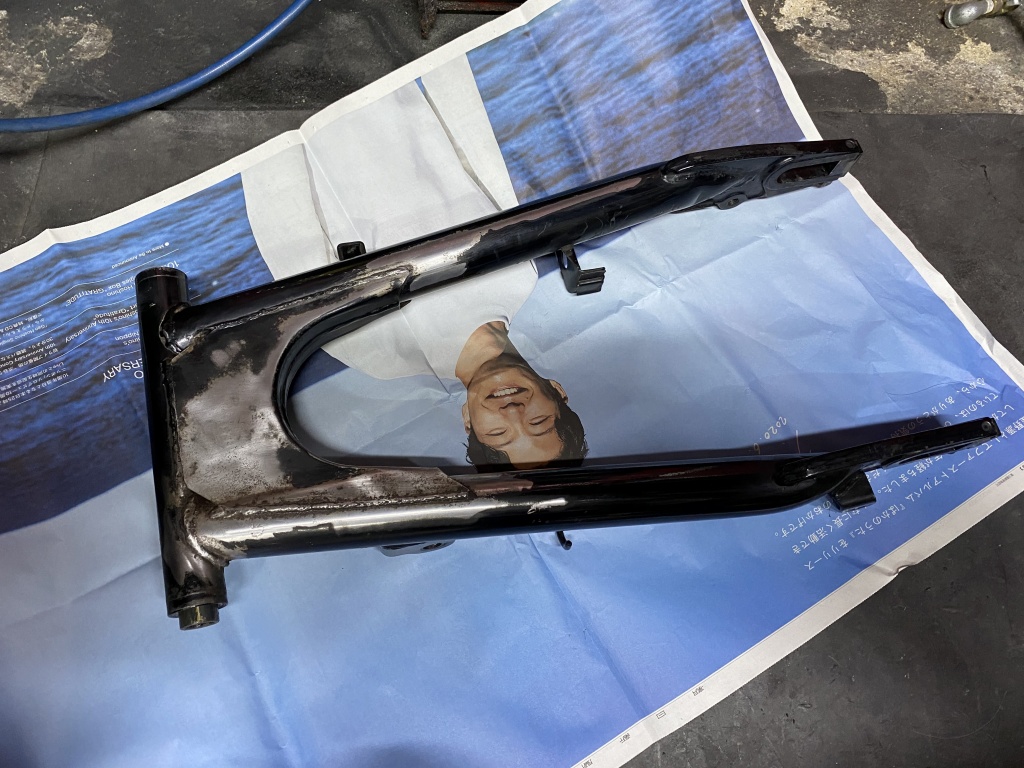 スイングアームはバッテリー液によると思われる腐食が多いので、大まかにサビを落として研磨します。