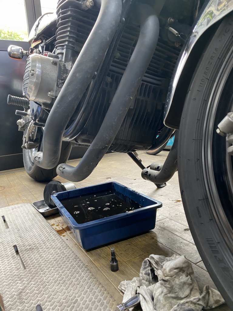 エンジンオイルを抜きます。走行直後なのでまだアツアツです。90℃くらいはあるでしょう。