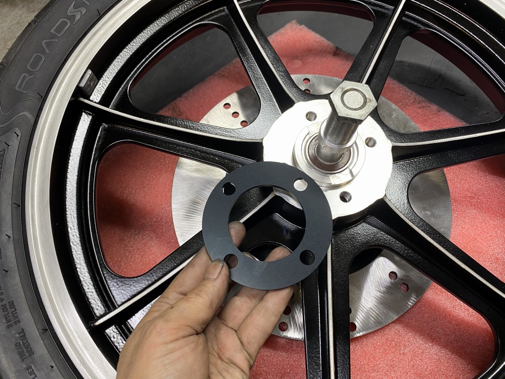 ローター取付面にスペーサーを入れ、左右ともに外側にオフセットさせます。