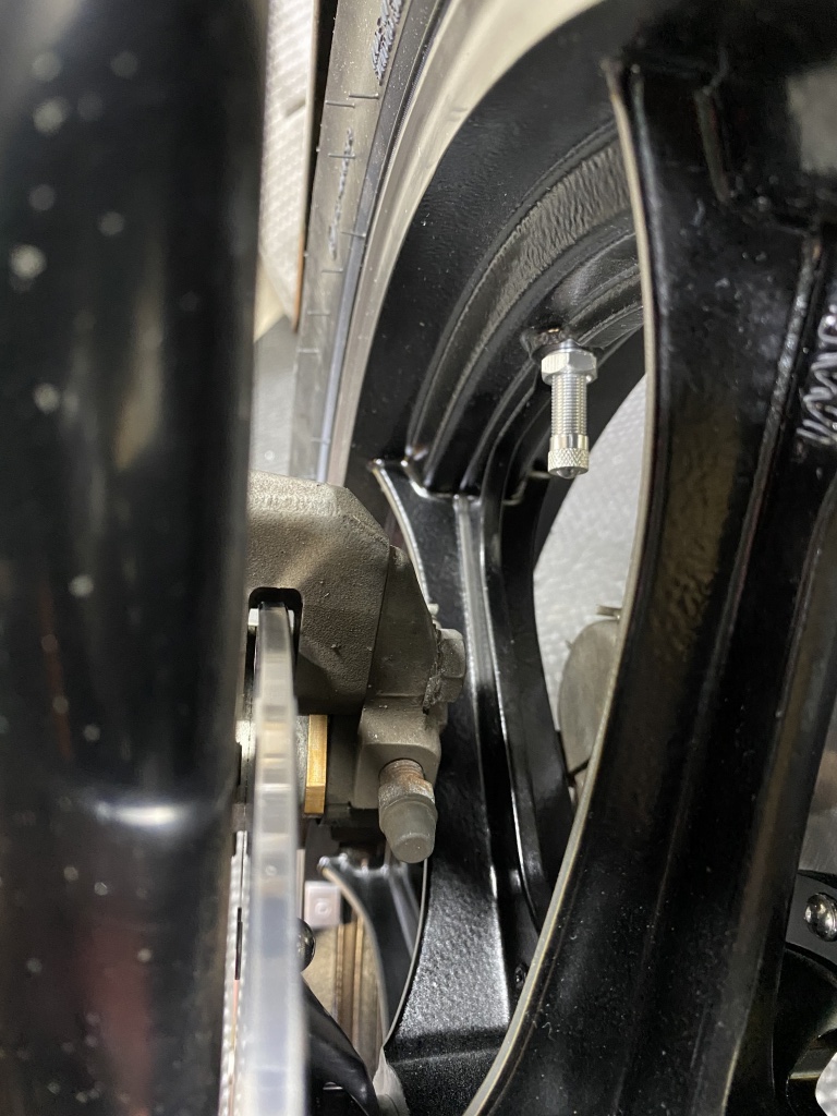 ローター径がφ296ミリと小さめなので、キャリパーとホイールのスポークが干渉するようです。