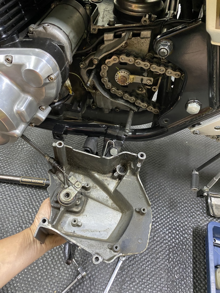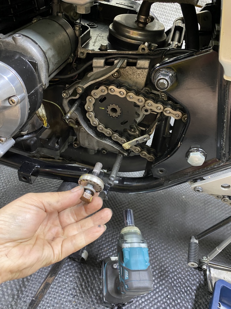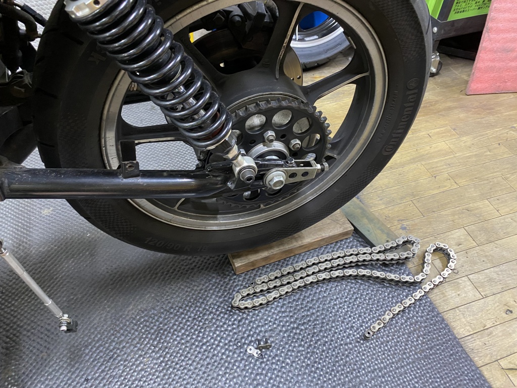 トラススイングアームに変更するので、チェーンも一旦切断します。