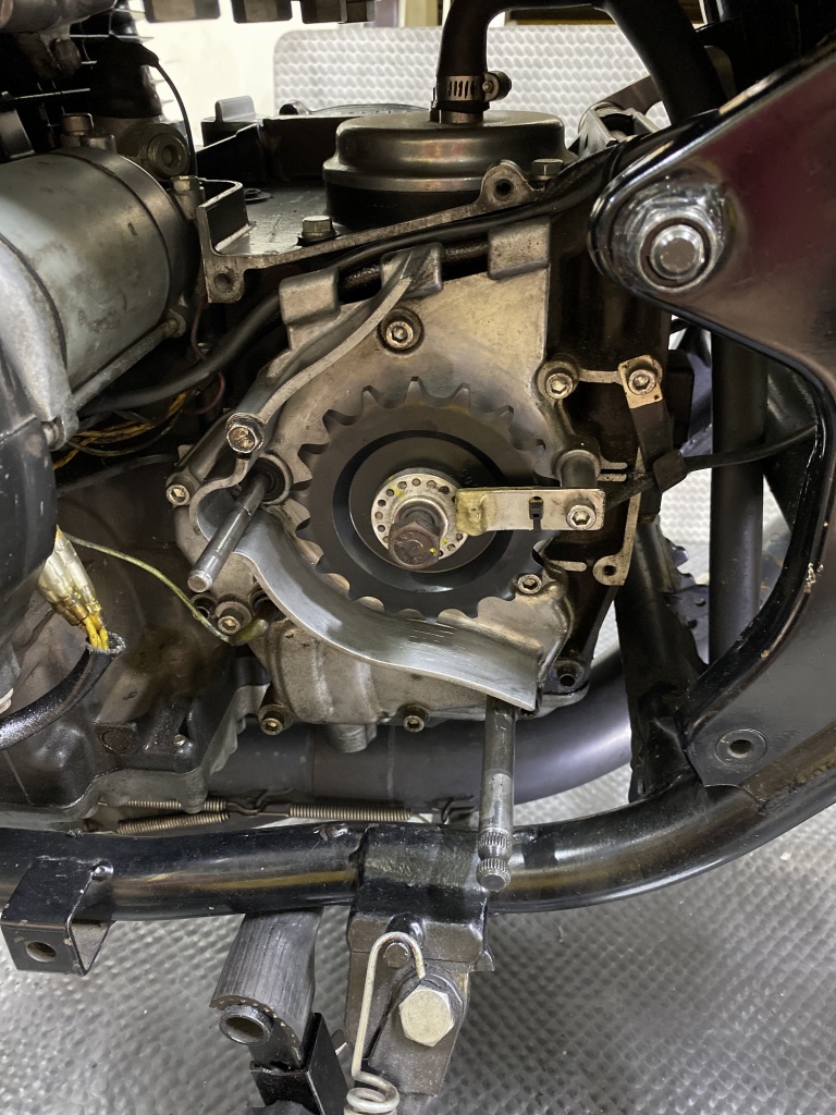 ワイドホイール化でチェーンラインが5ミリオフセットされるので、フロントスプロケも変更します。スピードメーターセンサーは旧タイプのマグネット式です。